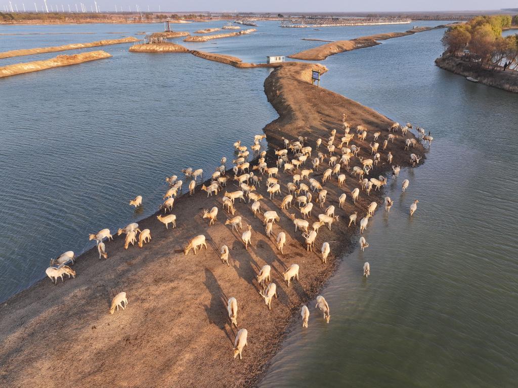 2024年12月21日在大丰野鹿荡拍摄的麋鹿(无人机照片)。新华社记者 季春鹏 摄