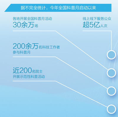 新修订的《中华人民共和国科学技术普及法》规定,每年9月为全国科普月。今年首个全国科普月的主题为“科技改变生活 创新赢得未来”,聚焦宣传推广科技创新成果、弘扬科学精神和科学家精神、广泛开展群众性科普等内容,多地推出的科普游园、科学漫步等活动受到公众欢迎。