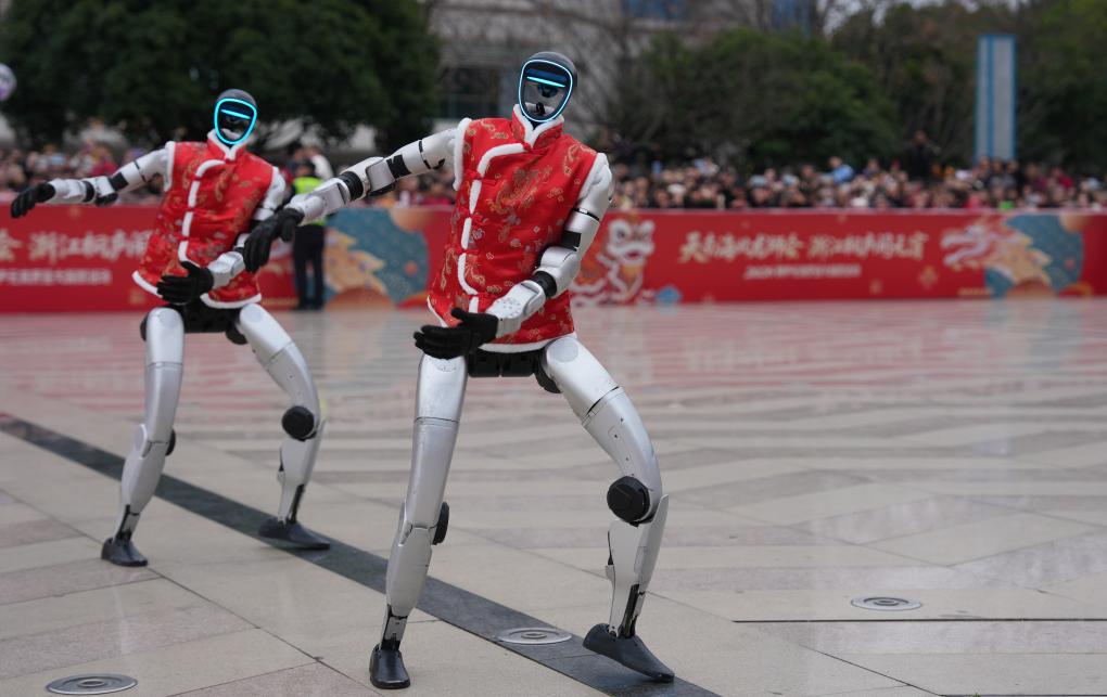 2026年,宇树科技人形机器人在浙江省桐庐县中心广场表演舞蹈。新华社记者 黄宗治 摄