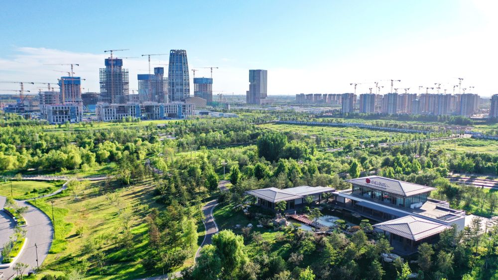 雄安商务服务中心是新区首个标志性城市建筑群,建筑风格以东方美学立体展现雄安特色风貌,功能包括酒店、专家公寓、商业等。2022年底,该中心投入使用。通过绿色建筑技术的集成与创新,这里实现了绿建三星标准全覆盖,项目预计每年可节约用电1100万度。这是2022年3月28日拍摄的雄安商务服务中心。