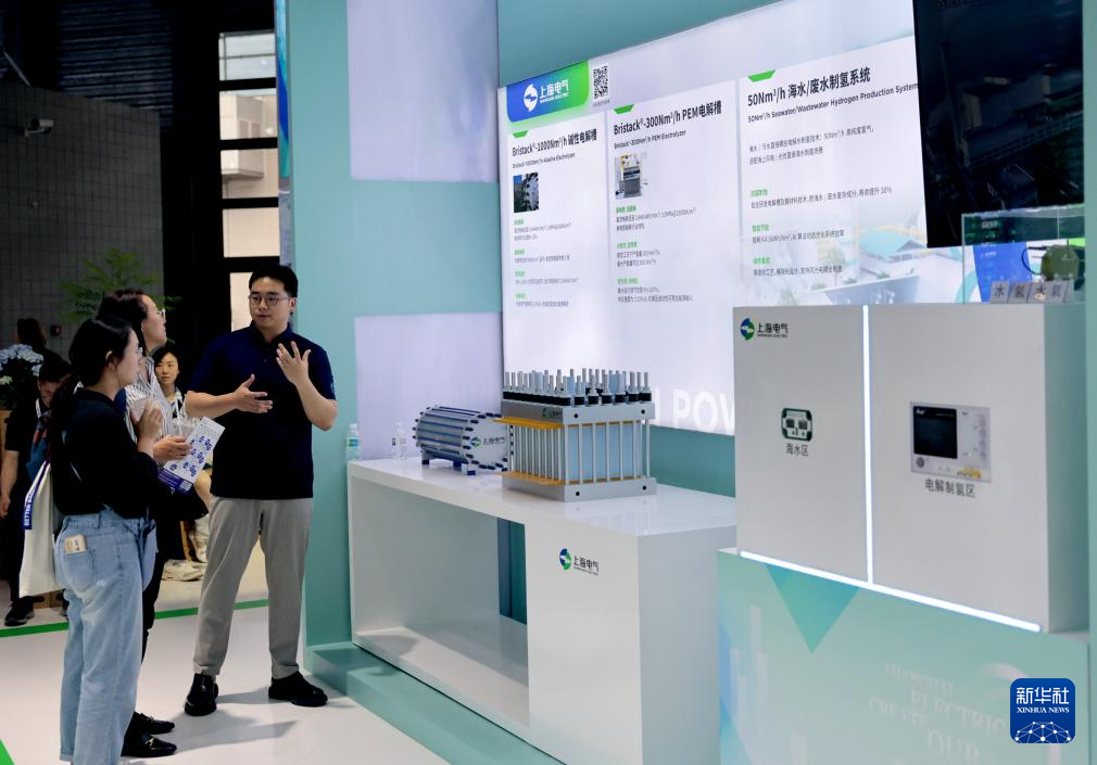 6月5日,工作人员(右)在向参观者介绍电解槽制氢设备。新华社记者 方喆 摄