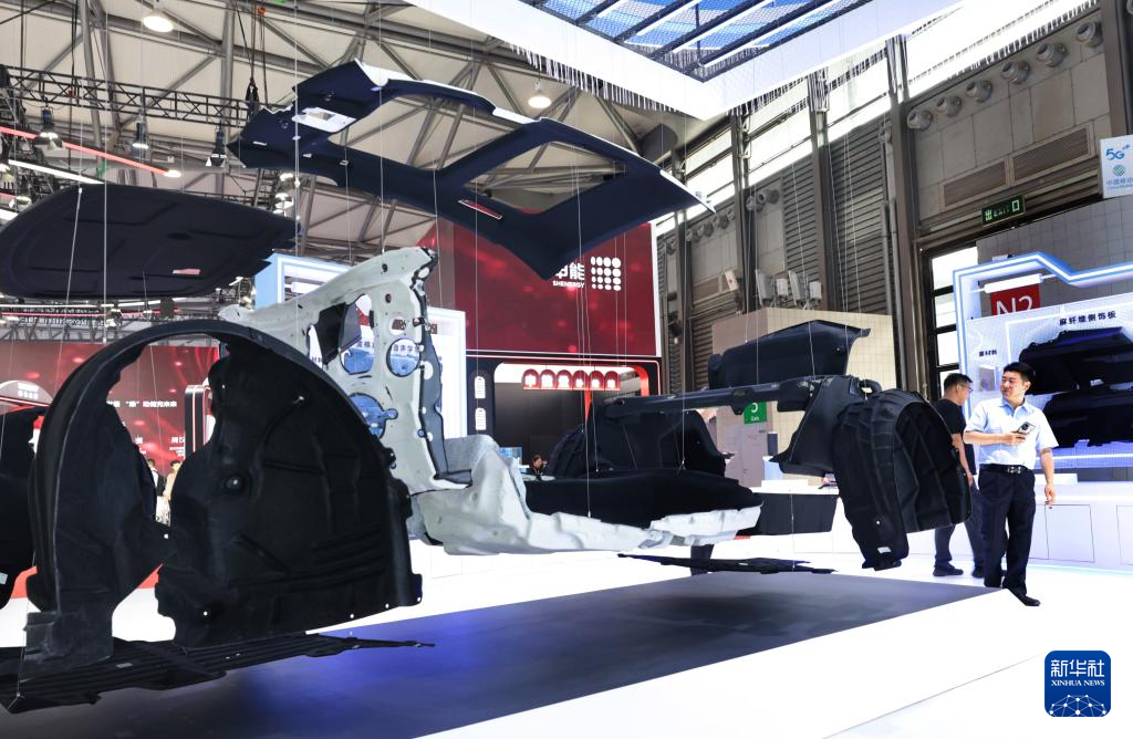 6月5日,参观者在一组低碳材料汽车内饰展品旁驻足观看。新华社记者 方喆 摄