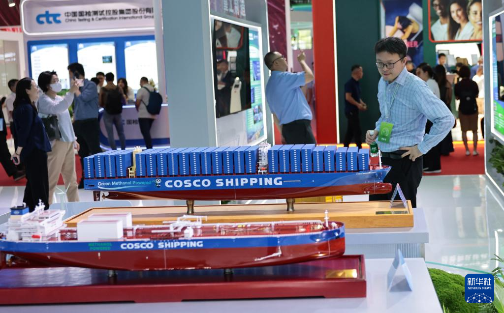 6月5日,参观者在一个甲醇双燃料动力集装箱船模型前驻足观看。新华社记者 方喆 摄