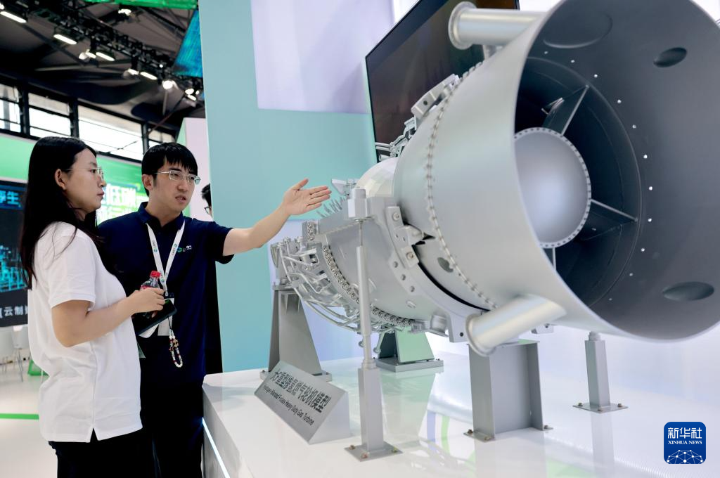 6月5日,工作人员(右)在一个重型掺氢燃气轮机模型旁向参观者做介绍。新华社记者 方喆 摄