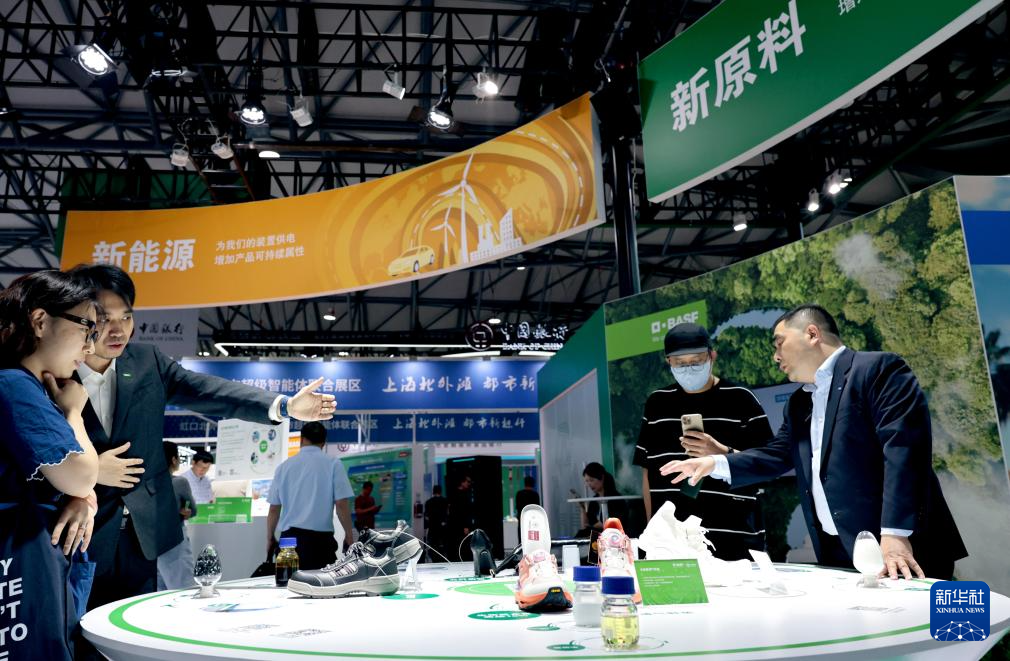6月5日,工作人员在一组新材料应用产品展示台前向参观者做介绍。新华社记者 方喆 摄