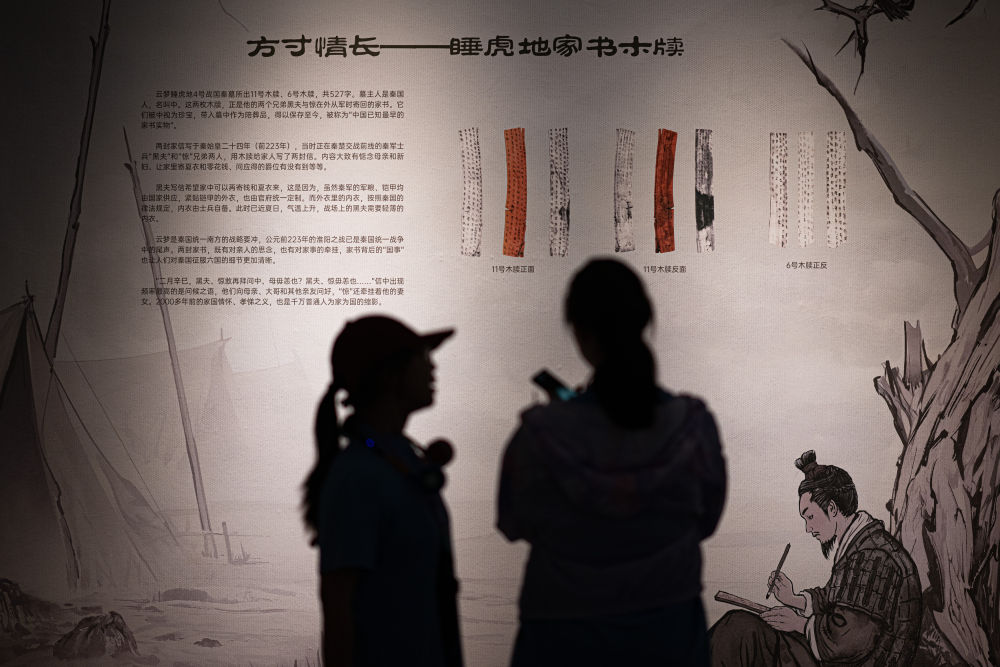 ↑ 6月6日,参观者在现场观看睡虎地家书木牍。