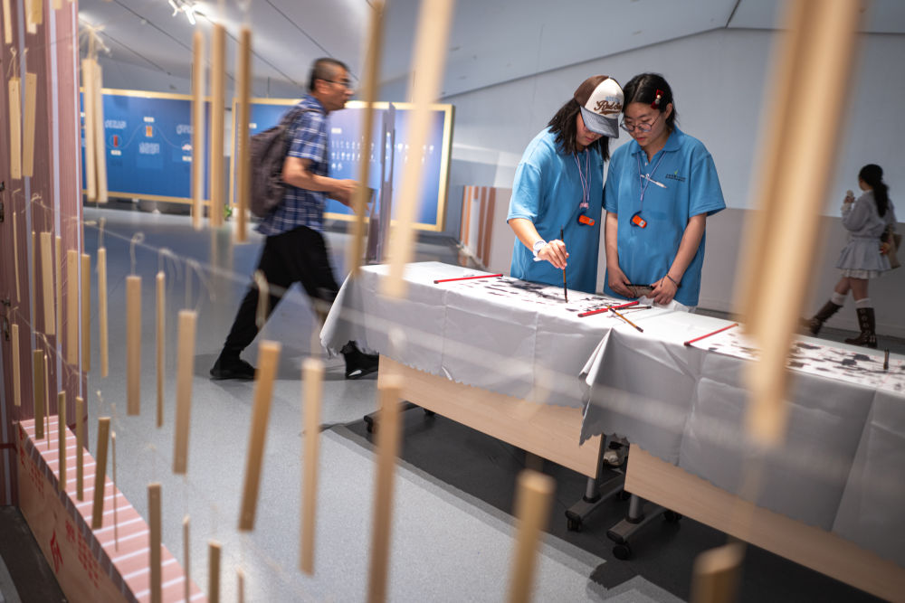 ↑ 6月6日,参观者在“家国信史——长江中游简牍文物展”上体验书写。