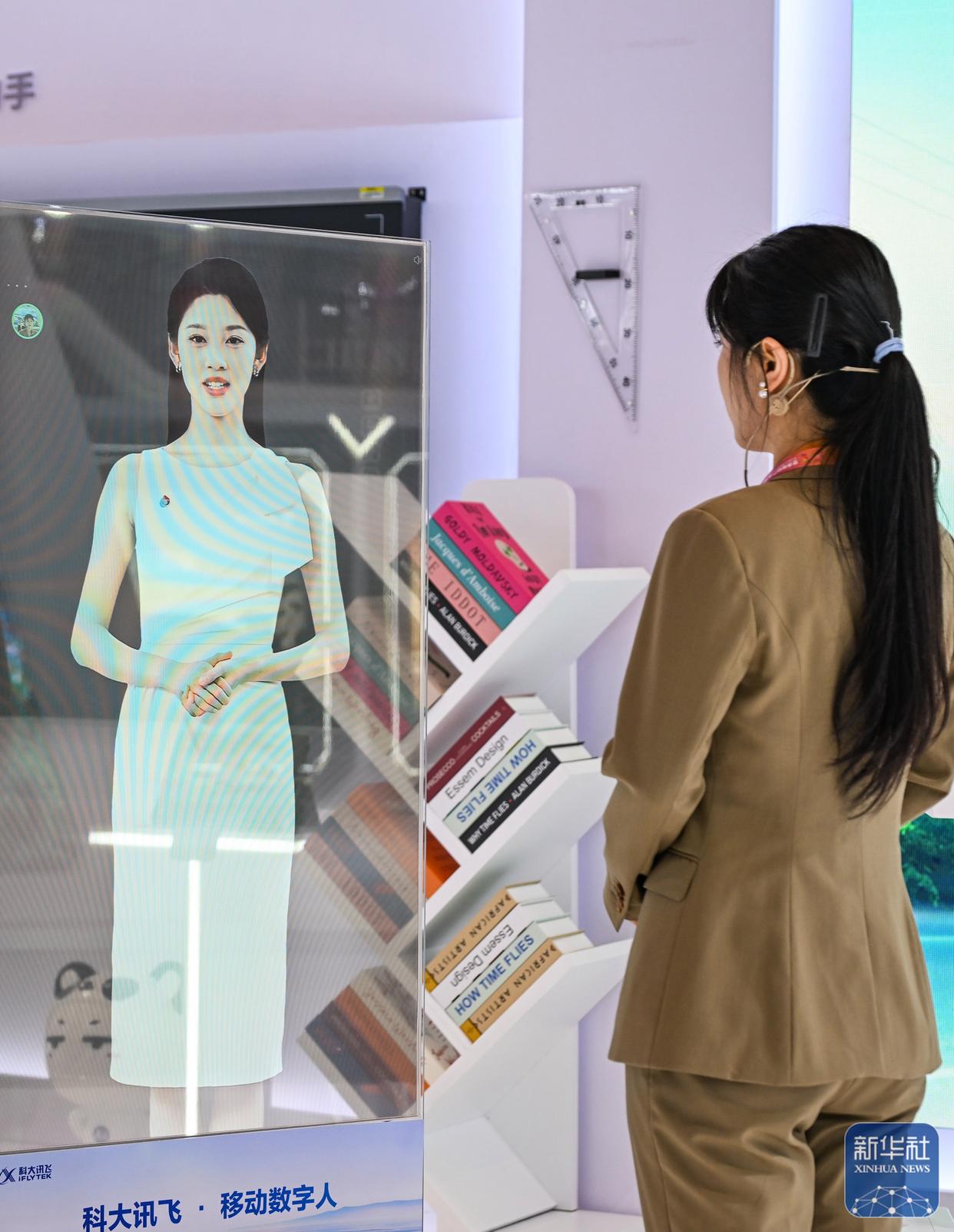 9月4日,工作人员在2025世界智能产业博览会科大讯飞展厅与移动数字人互动。