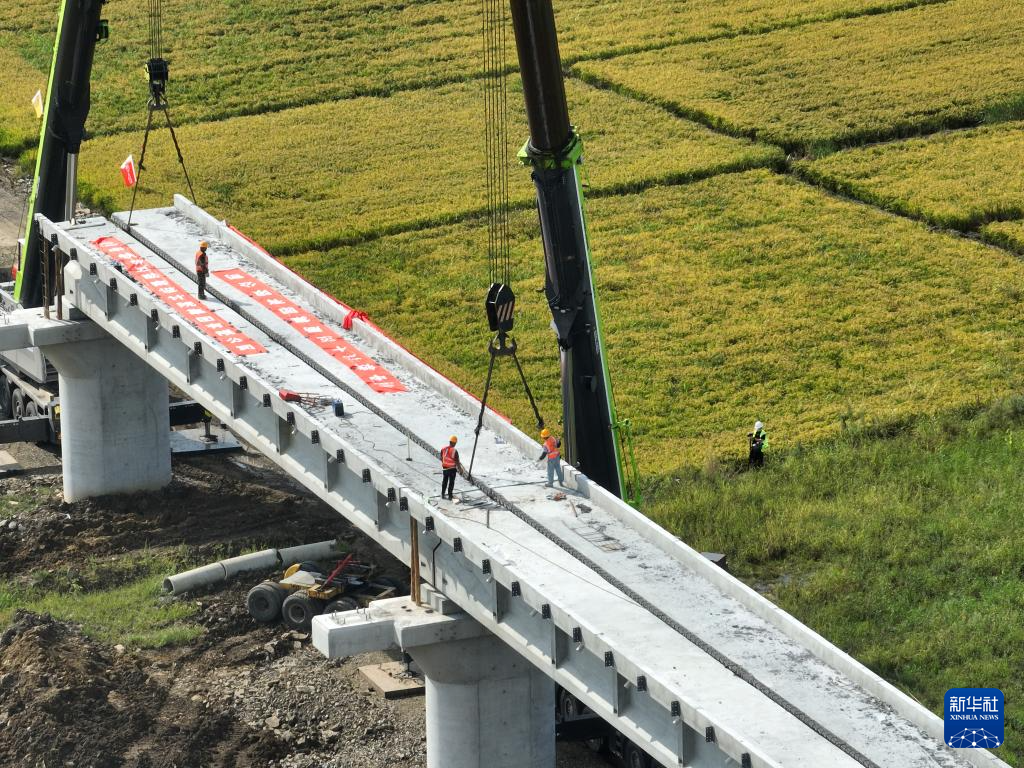 这是9月5日拍摄的佳木斯至同江铁路扩能改造工程同江特大桥架梁施工现场(无人机照片)。新华社记者 王松 摄