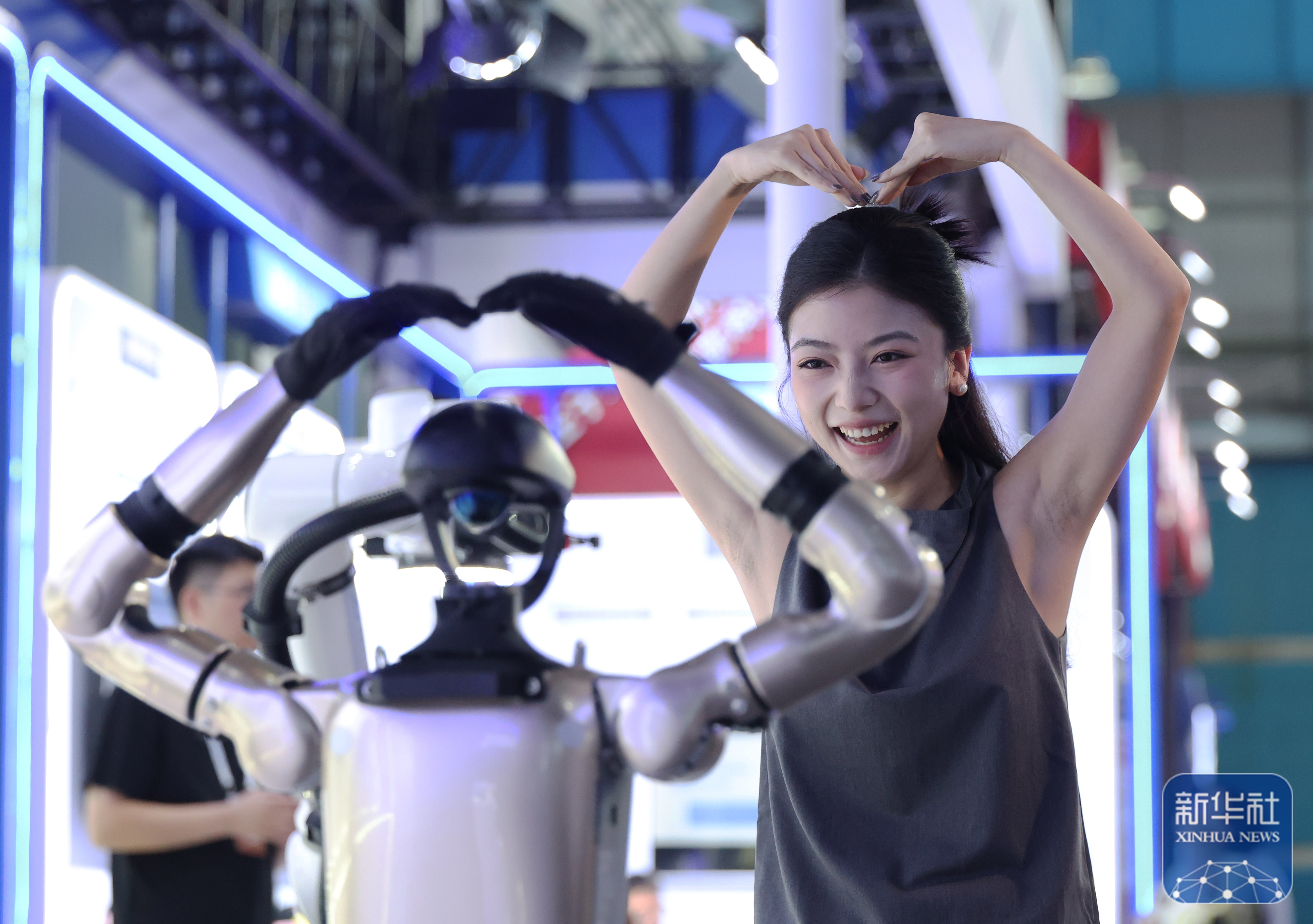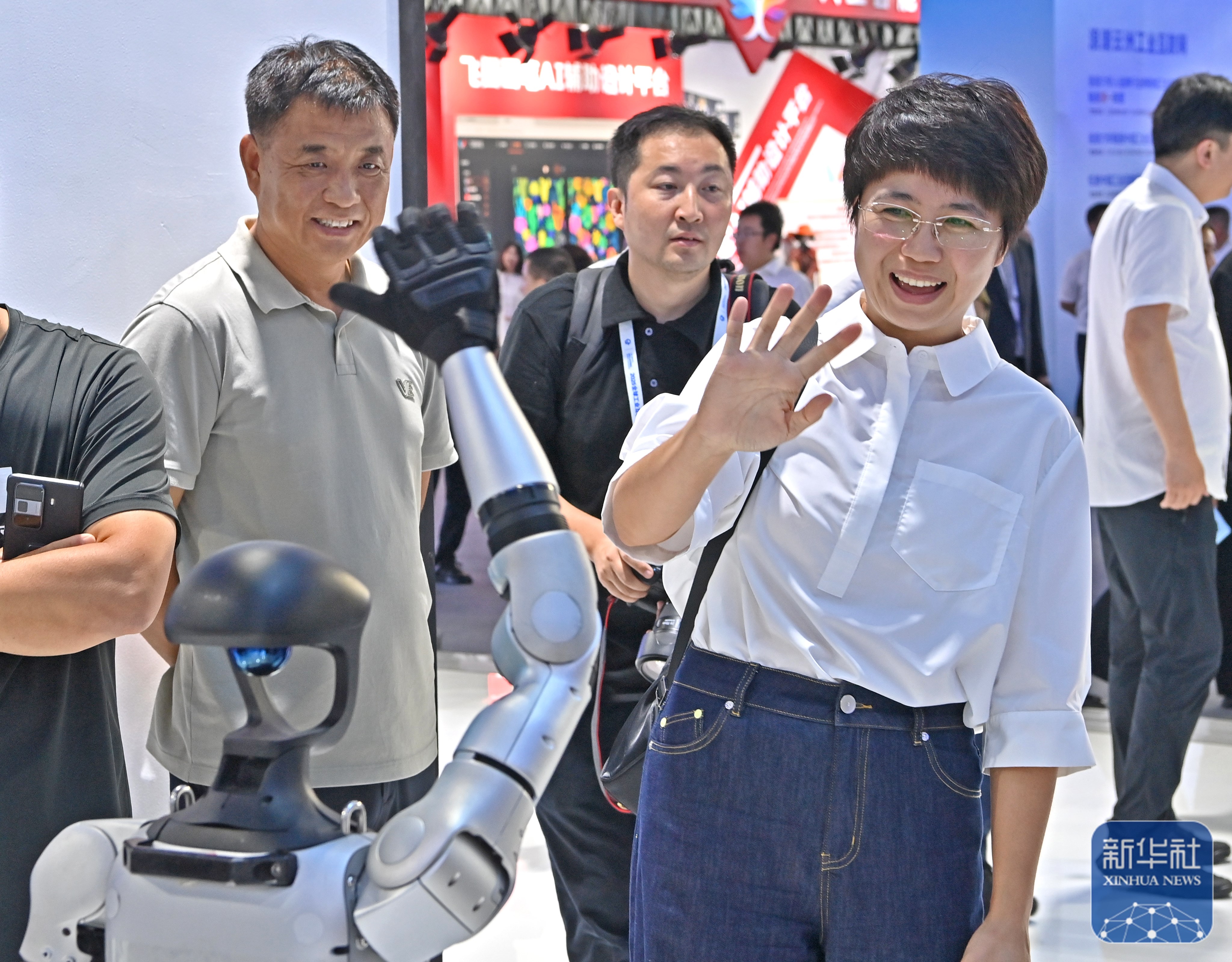 ↑ 9月6日,观众在2025全球工业互联网大会现场与机器人互动。新华社记者 周华 摄