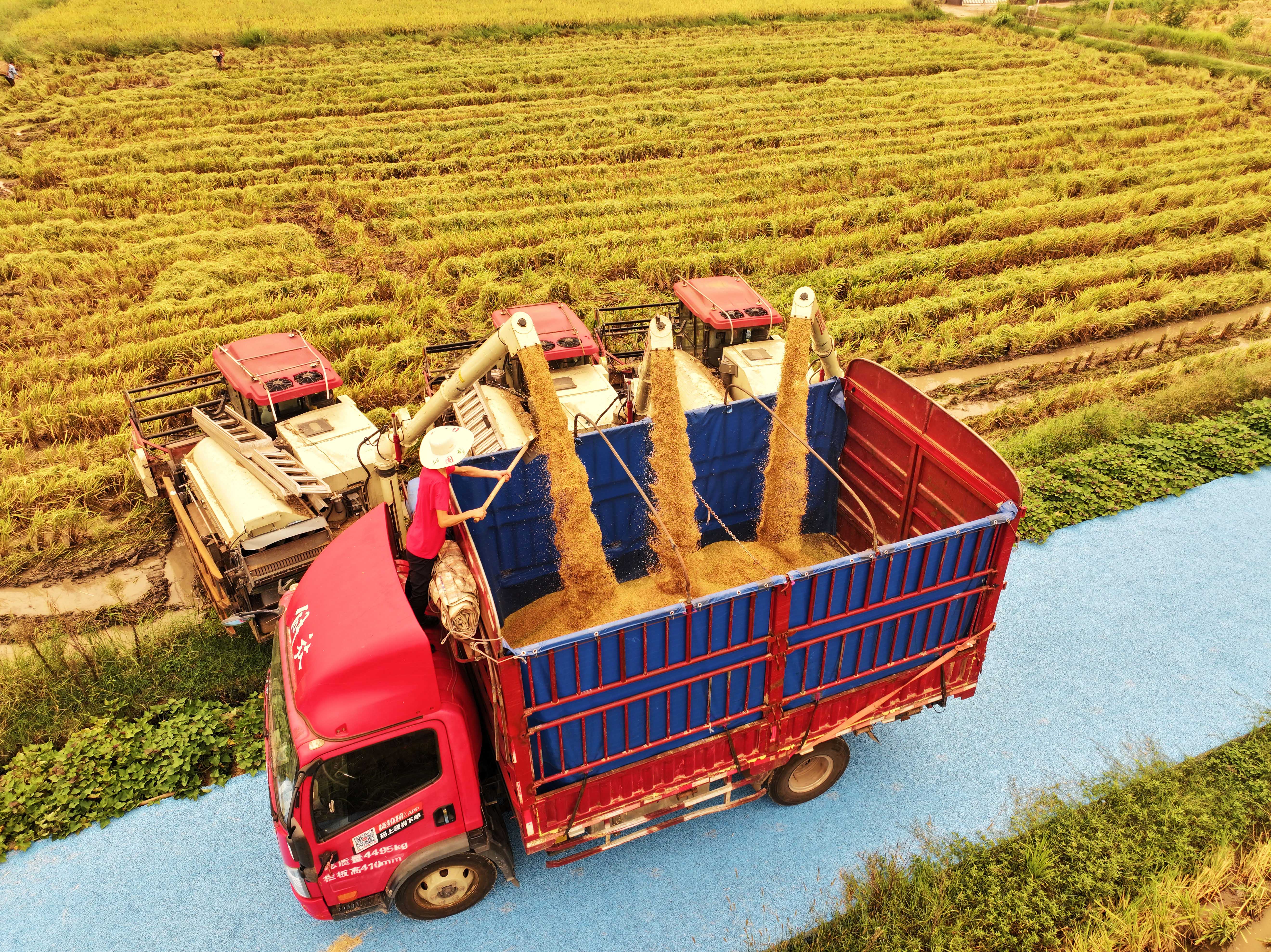 ↑ 9月6日,农民在湖北省武汉永旺智慧农场将收获的水稻装车。新华社发(赵军 摄)