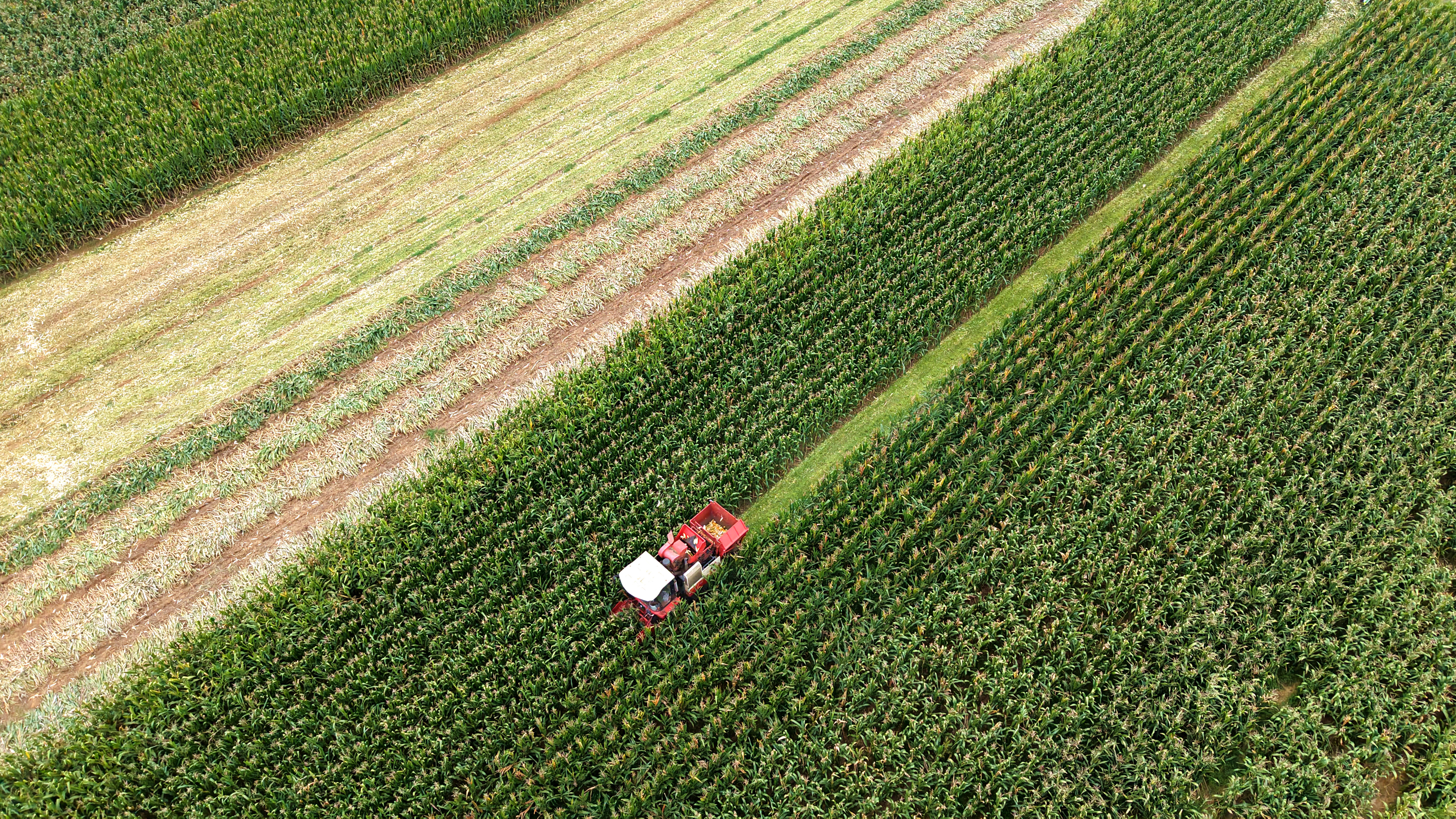 ↑ 9月5日,山东省临沂市平邑县临涧镇农民驾驶农机在田间收获玉米(无人机照片)。新华社发(武纪全 摄)