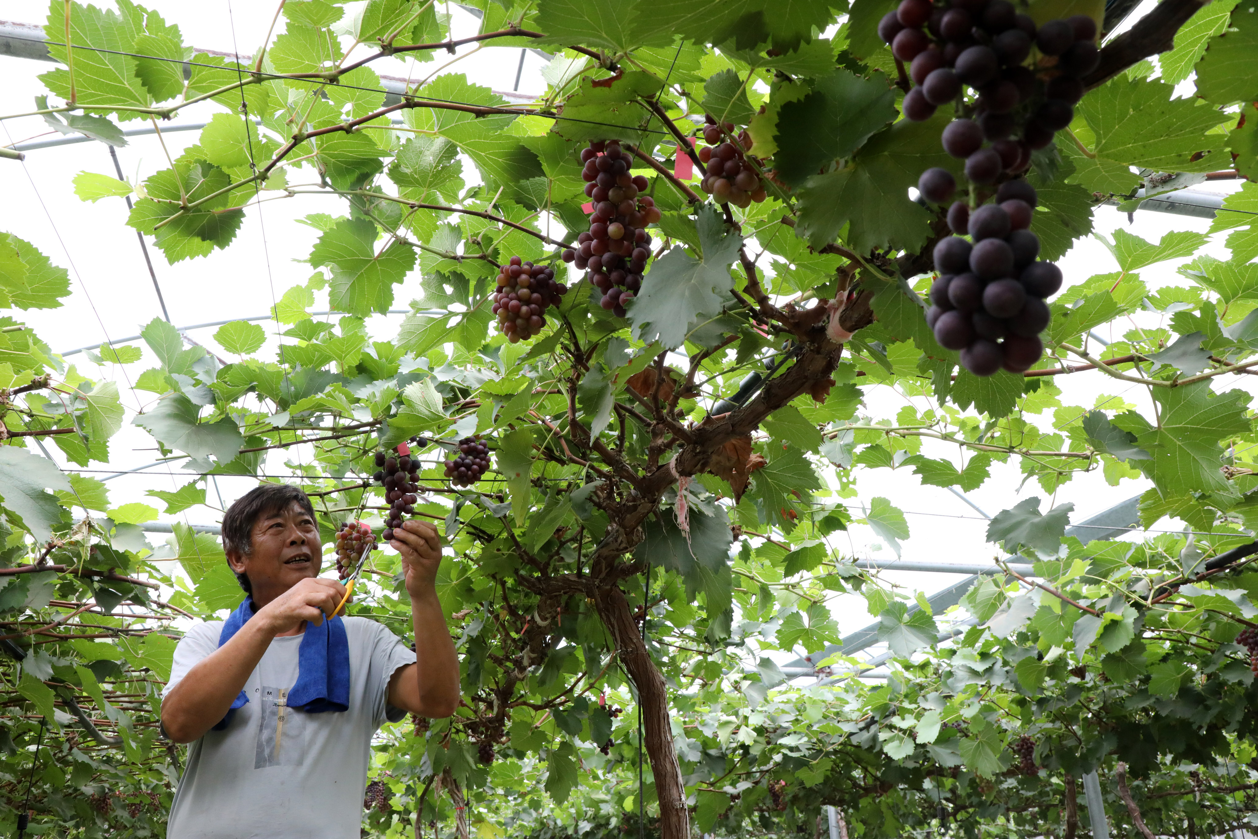 ↑ 9月6日,在山东省滨州市博兴县庞家镇焦集村,农民采摘葡萄。新华社发(陈彬 摄)