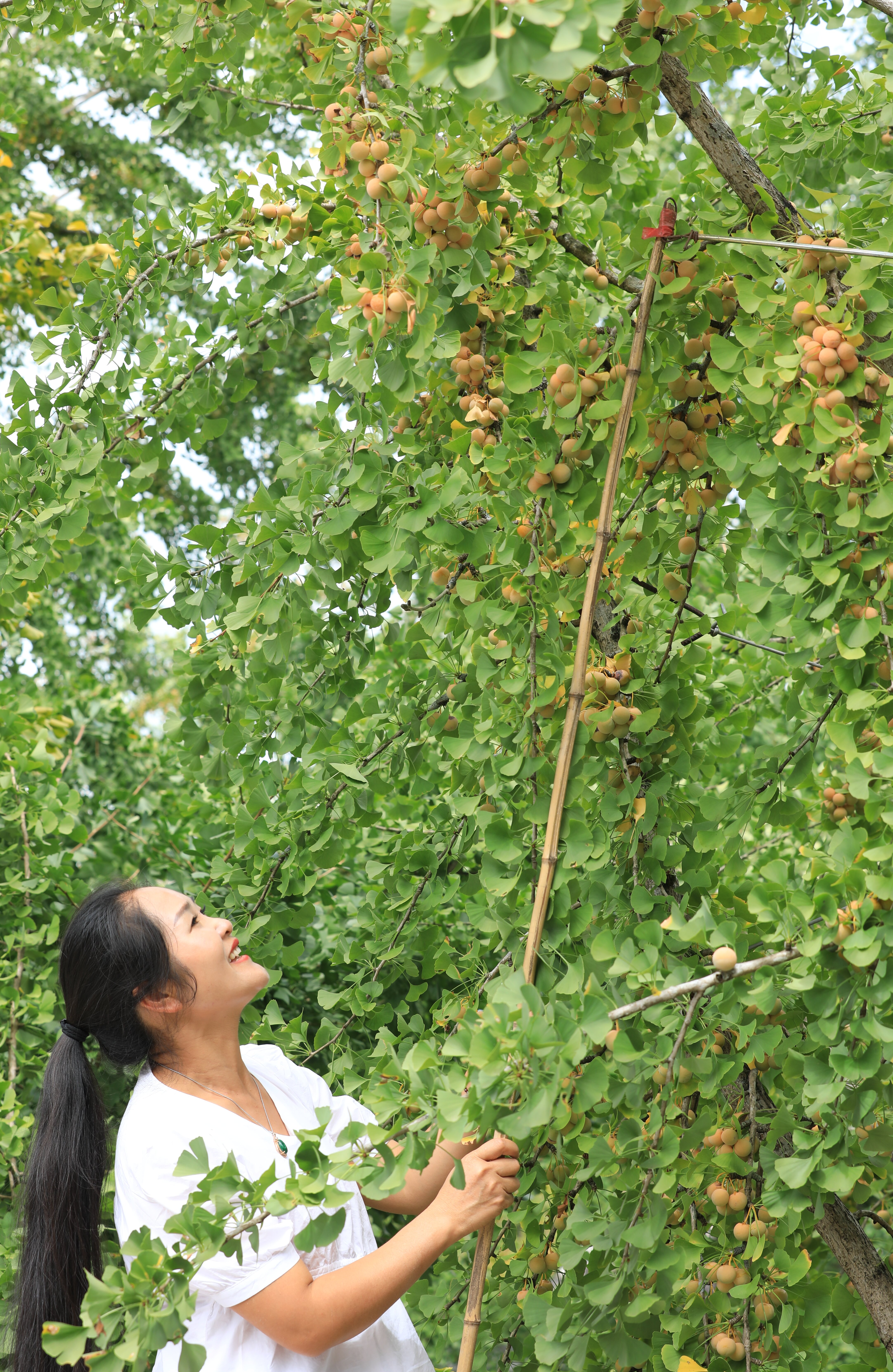 ↑ 9月6日,云南省腾冲市固东镇江东村村民用竹竿打落银杏果。固东镇江东村1万余亩银杏迎来丰收。新华社发(龚祖金 摄)