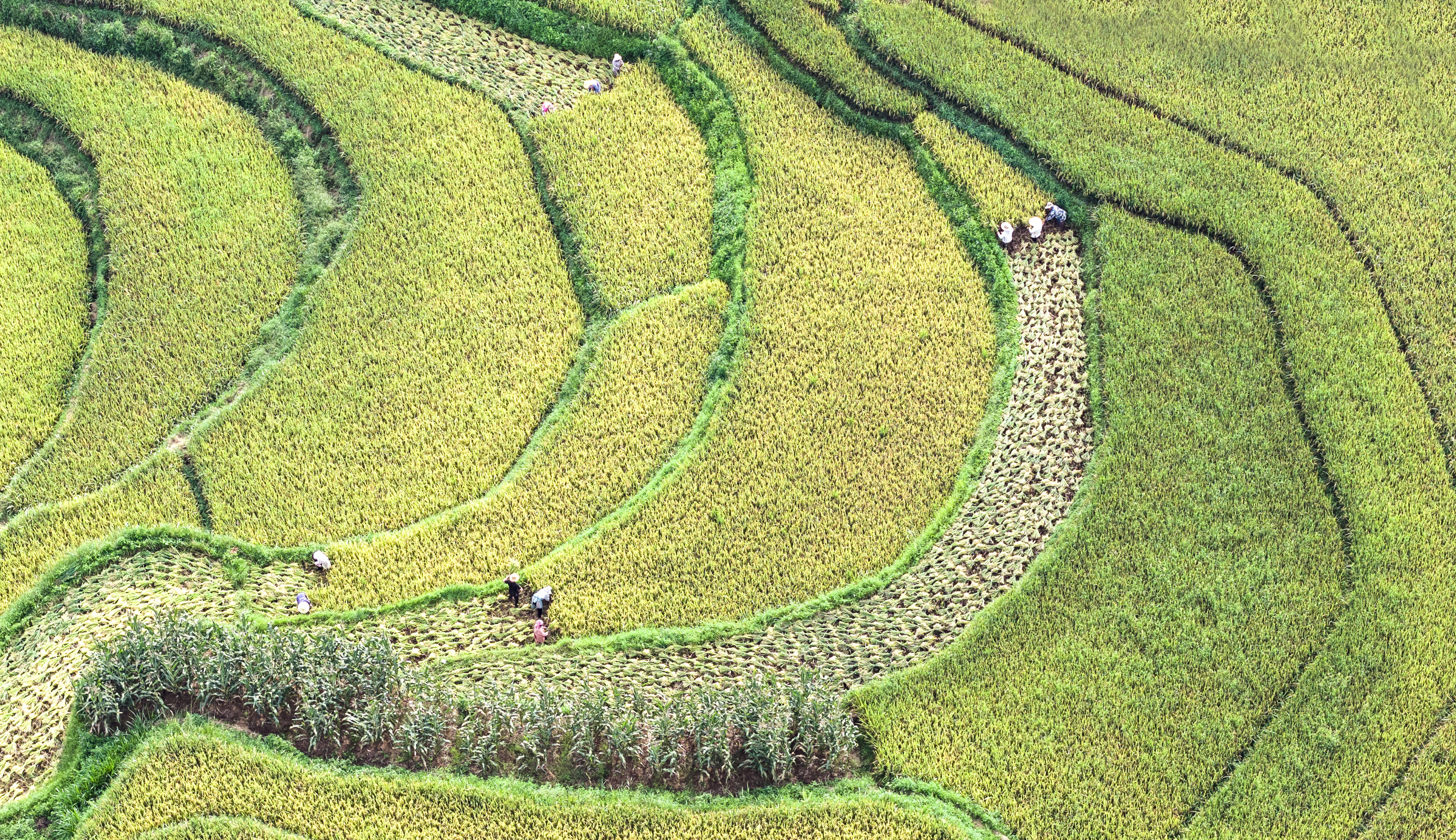 ↑ 9月6日,村民在云南省文山壮族苗族自治州薄竹镇莫哈纪村稻田里收割水稻(无人机照片)。新华社发(熊平祥 摄)