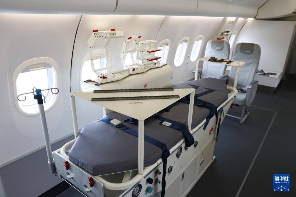 据悉,C909医疗机最大设计商载10吨,标准航程可达3700公里,具备高高原机场起降能力。舱内布局可根据不同救援需求灵活改装,能够满足医疗救援队伍出行、边远地区医疗救助、伤病员转运等多场景应。新华社发(徐炳南摄)