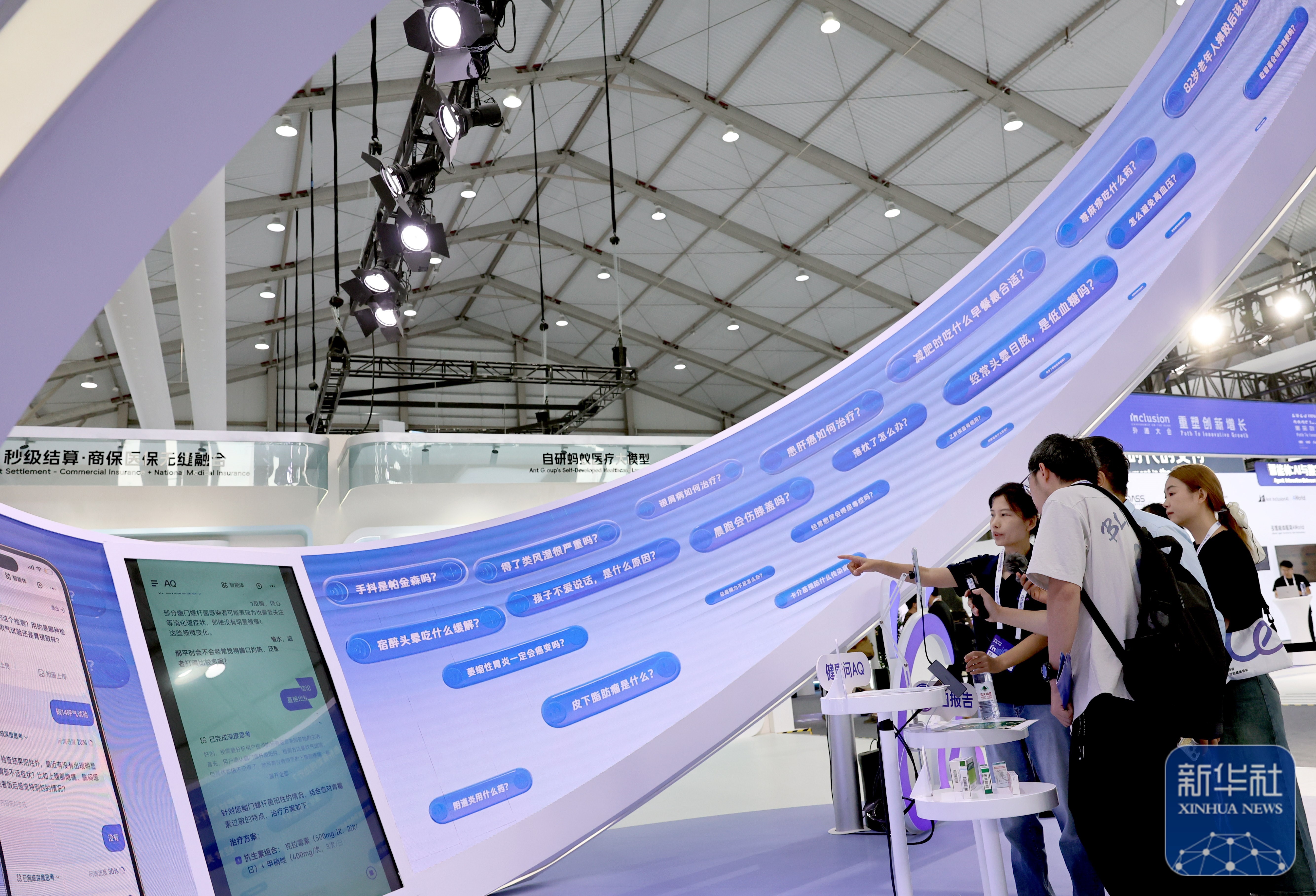 ↑9月10日,工作人员(左)在向参观者介绍AQ健康医生的人工智能产品。