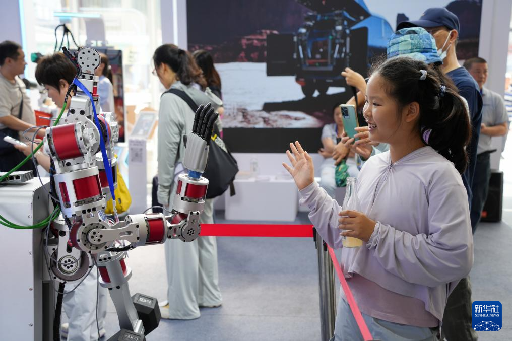 9月13日,参观服贸会的小朋友向机器人打招呼。新华社记者 周汀鹭 摄