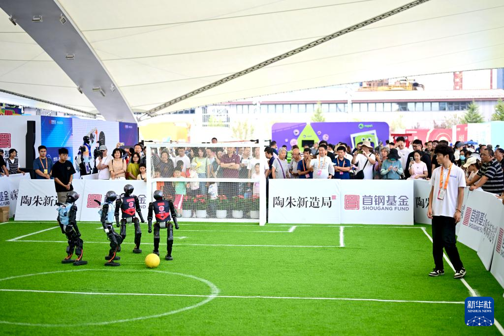 9月13日,人们在北京首钢园2025年服贸会体育服务专题展区观看人形机器人踢足球。新华社记者 陈晔华 摄