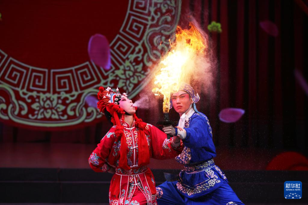 9月13日晚,在定西市陇中许铁堂秦腔剧院,演员表演秦腔绝活“吹火”。新华社发(王克贤摄)