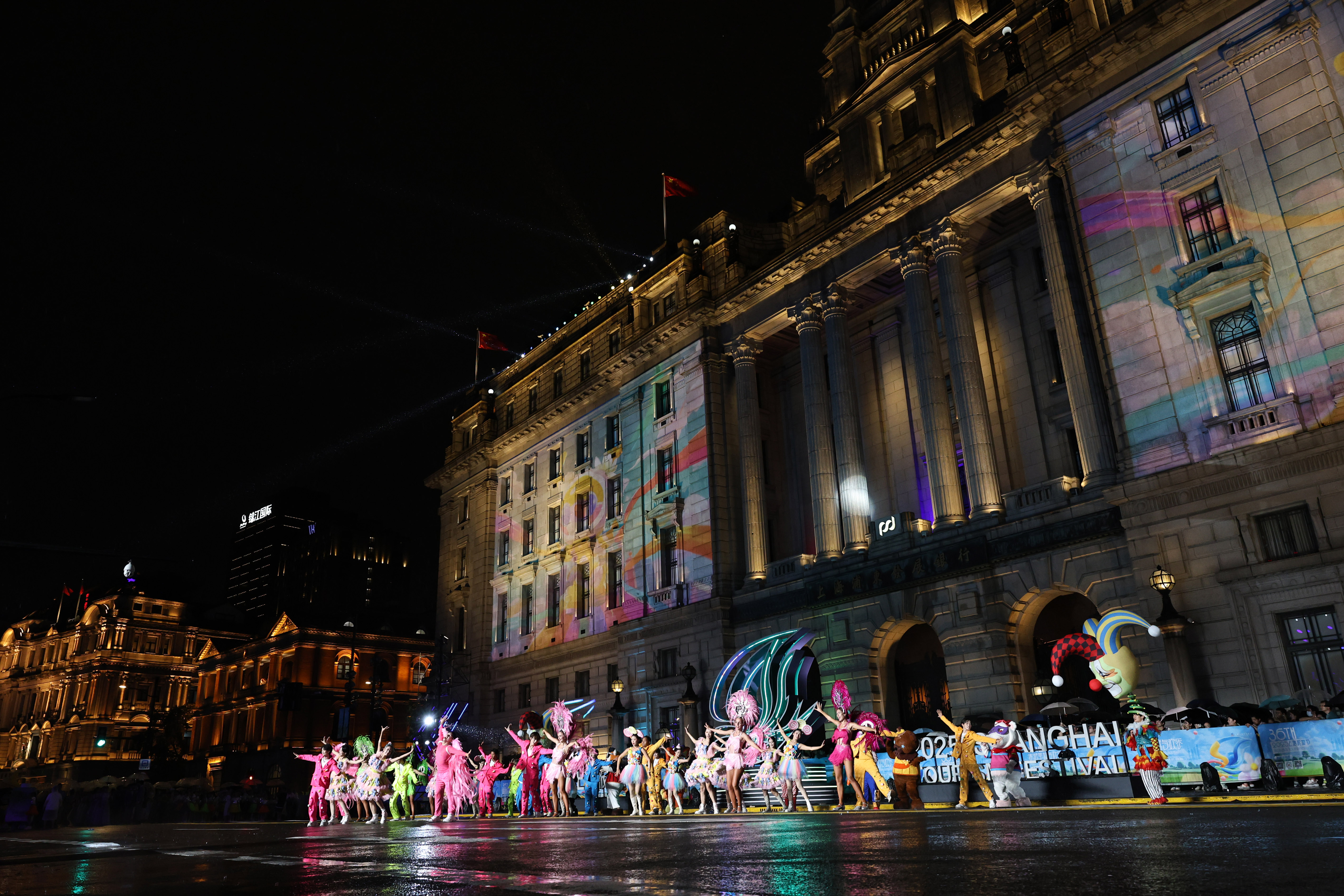 9月13日,上海旅游节花车巡游活动上,演员在外滩建筑前表演。
