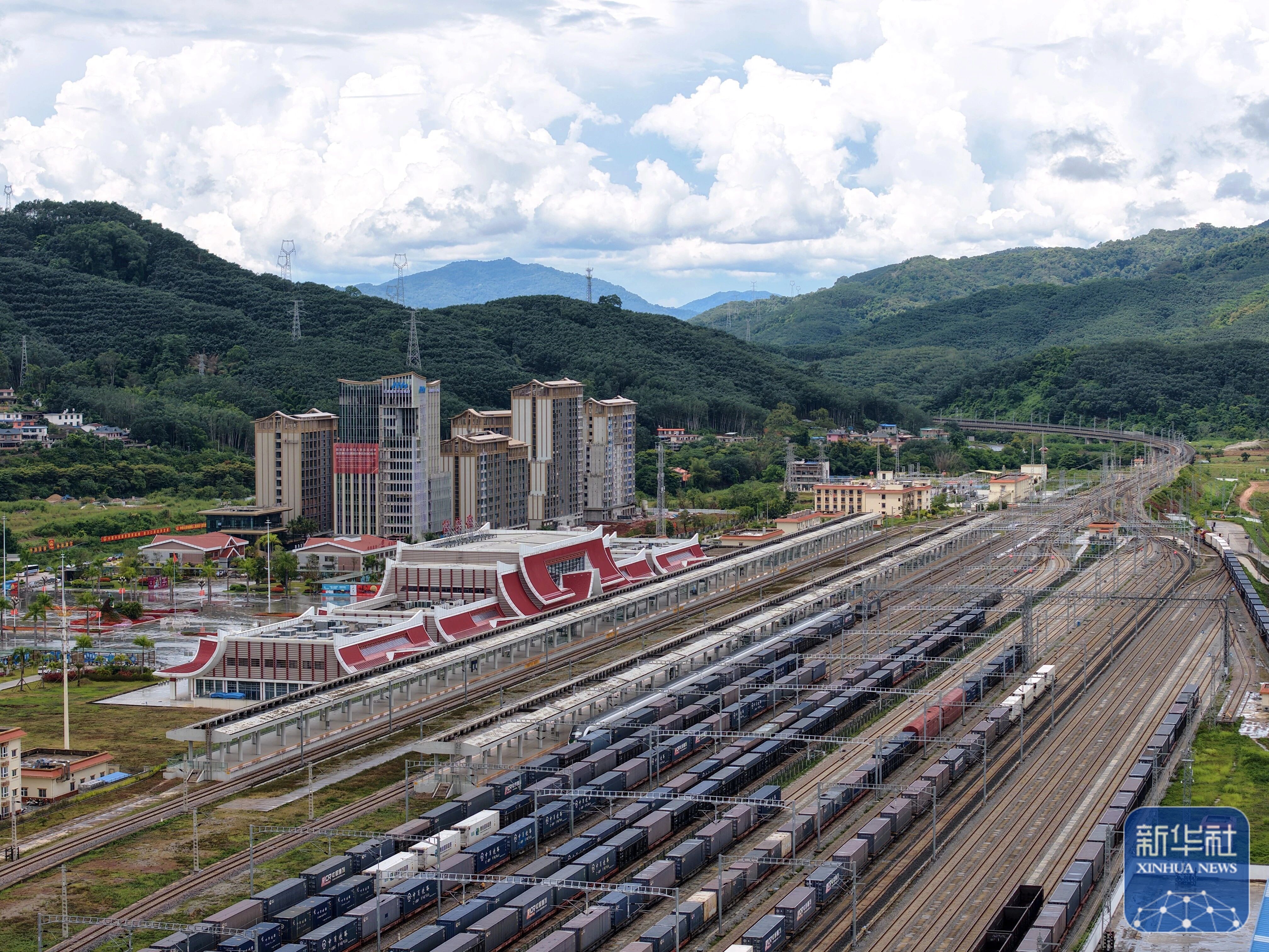 ↑ 9月21日,中老铁路上的货运列车在磨憨站通过(无人机照片)。