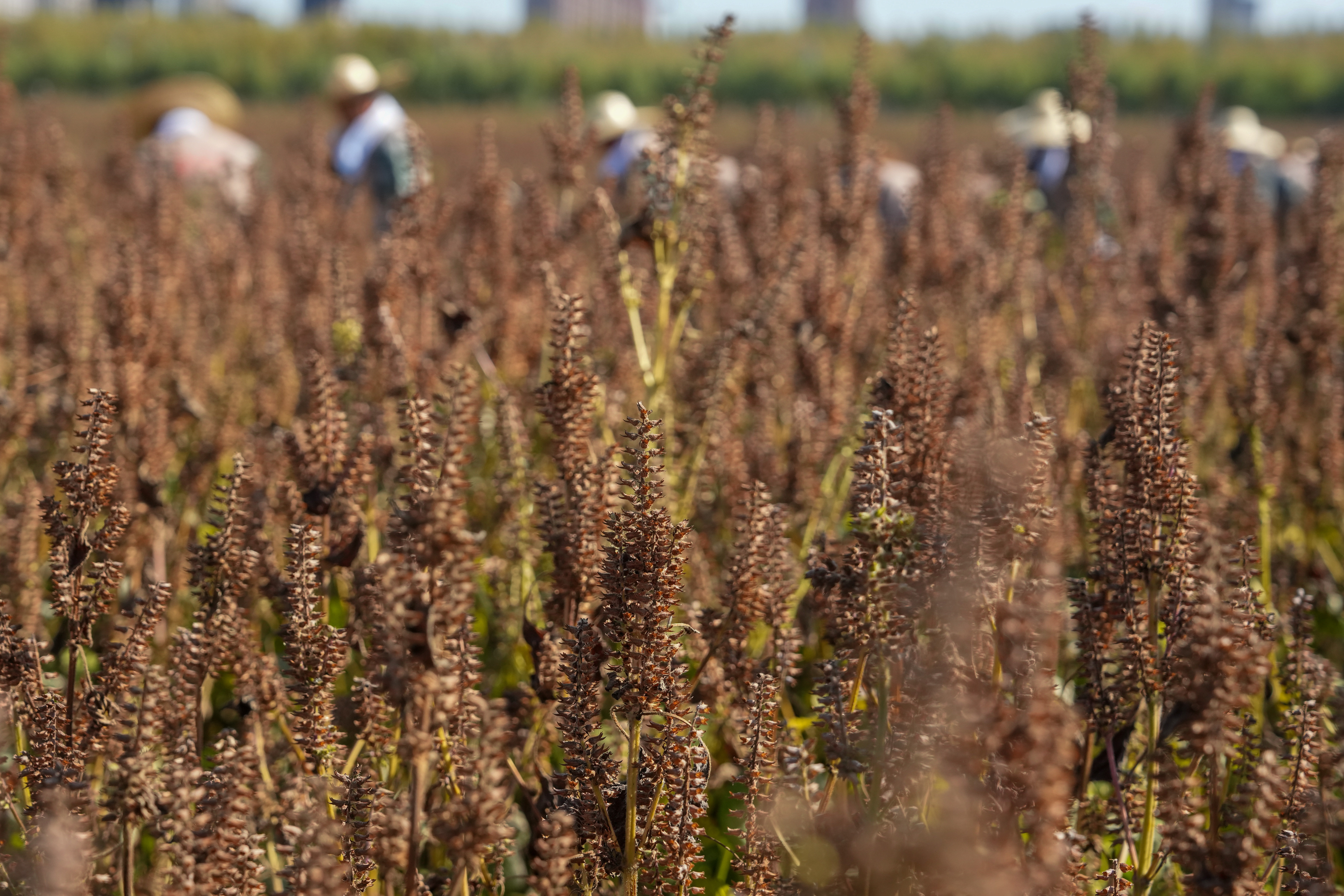 ↑9月23日,黑龙江省佳木斯市桦南县举办庆祝中国农民丰收节活动,工作人员进行紫苏收获展示。新华社记者 王建威 摄