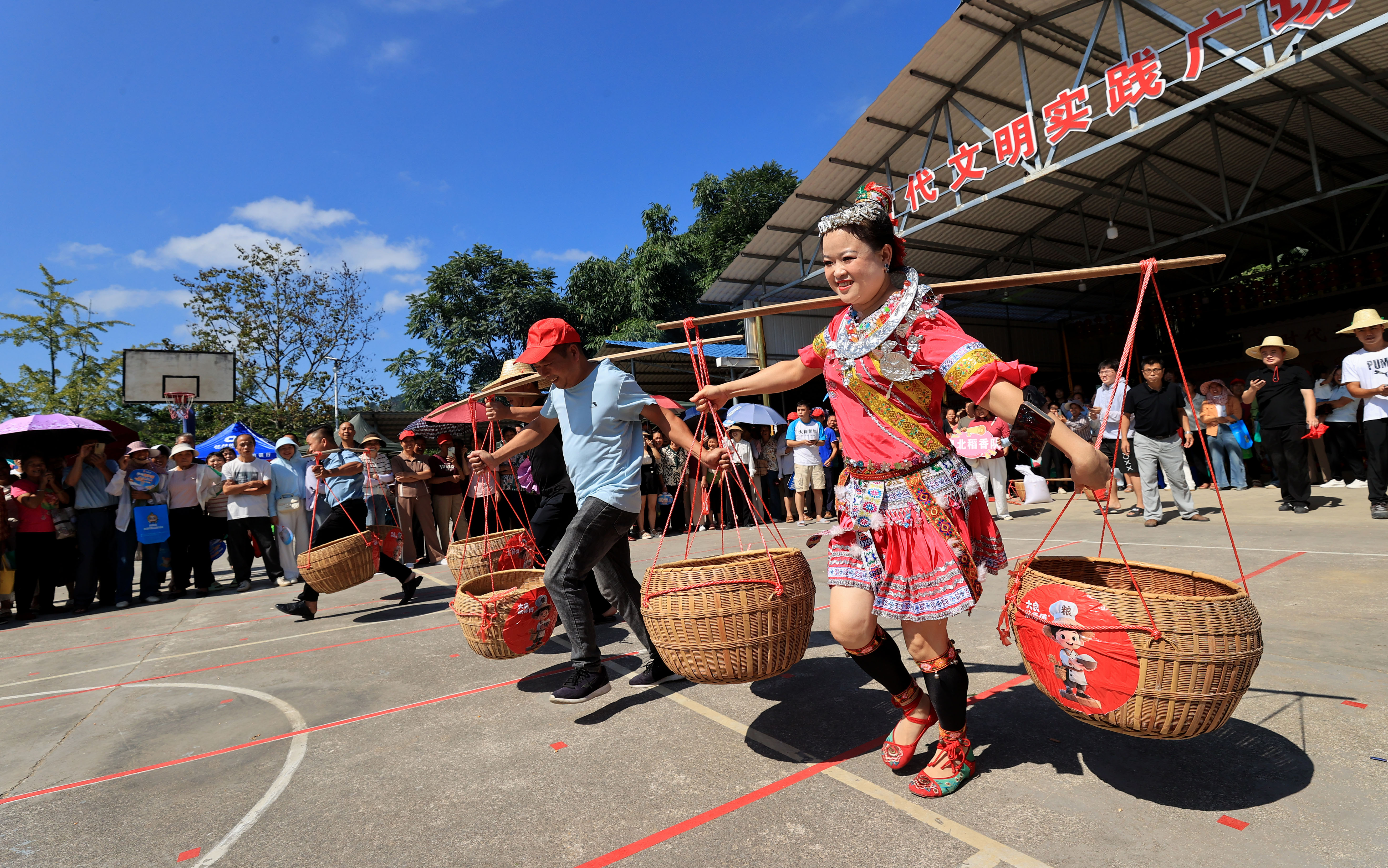↑9月23日,在广西柳州市融安县大良镇良北村年洞屯,农民在进行挑稻谷接力比赛。新华社发(谭克兴摄)