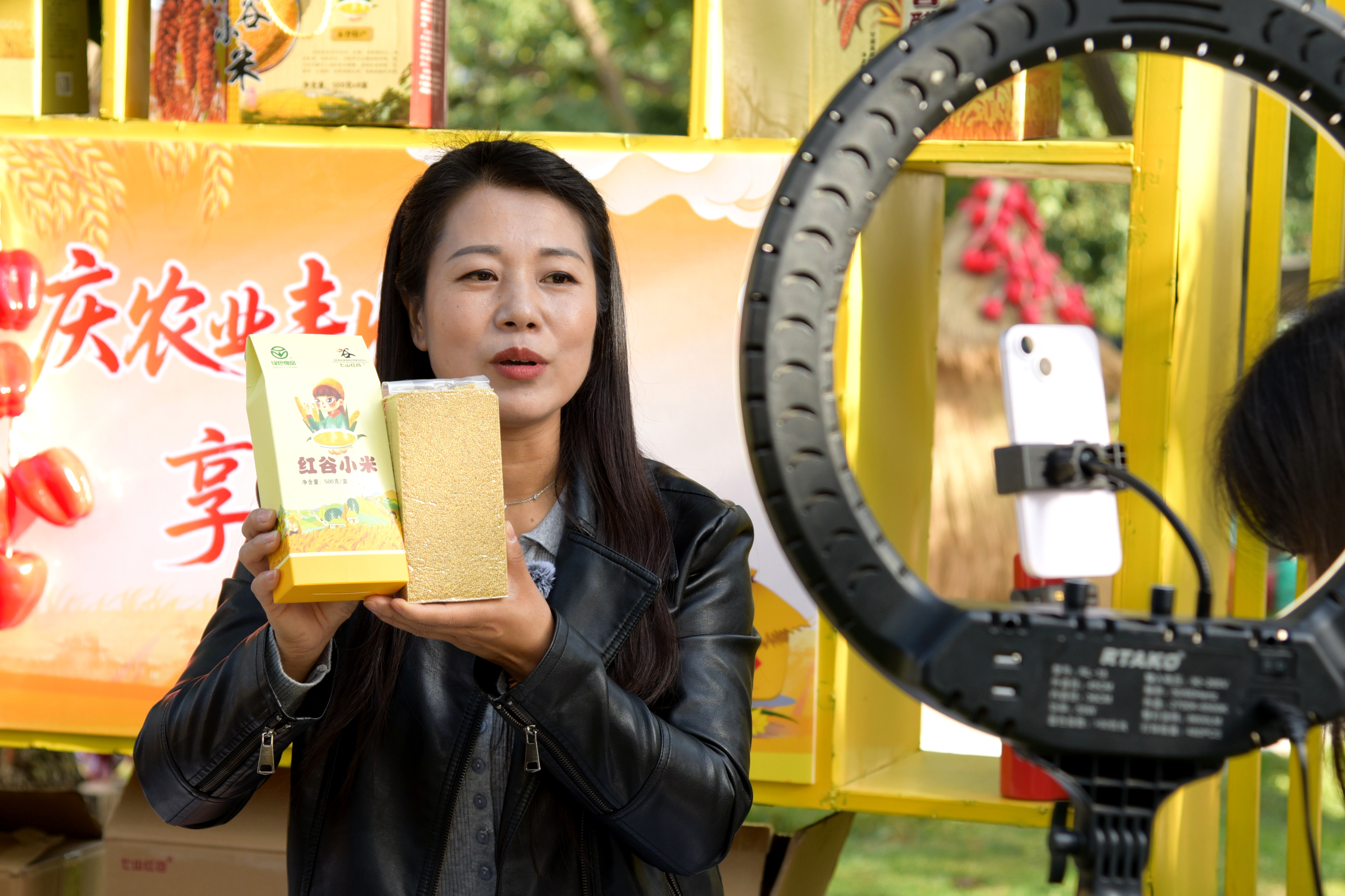 ↑9月23日,在甘肃省兰州市皋兰县什川古梨园举办的庆祝中国农民丰收节活动现场,参展人员在直播带货特色农产品。新华社记者 王朋 摄
