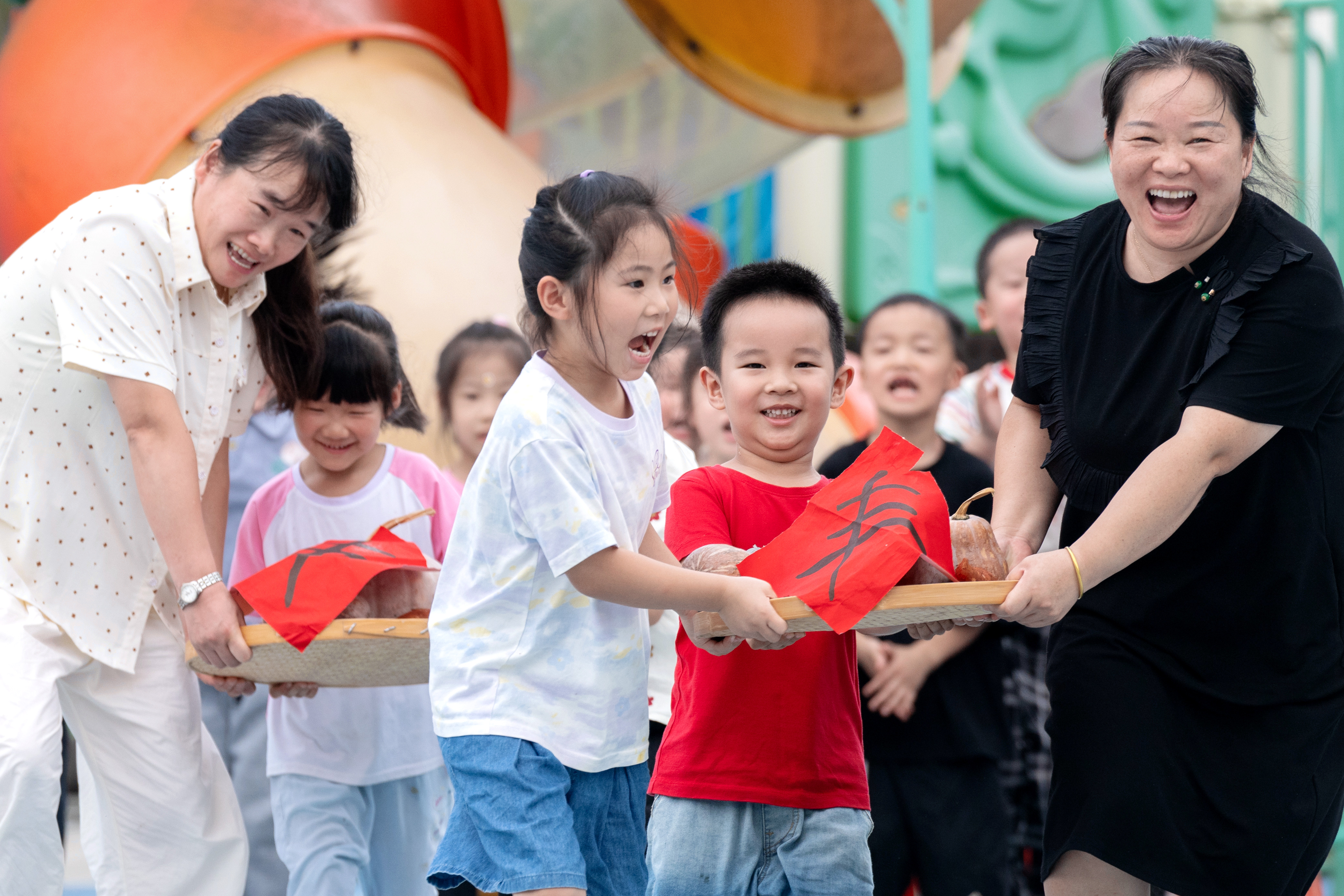 ↑9月23日,在浙江省湖州市长兴县煤山镇白岘中心幼儿园,孩子们与当地农民一起参与“运粮接力”趣味农耕运动。新华社发(谭云俸摄)