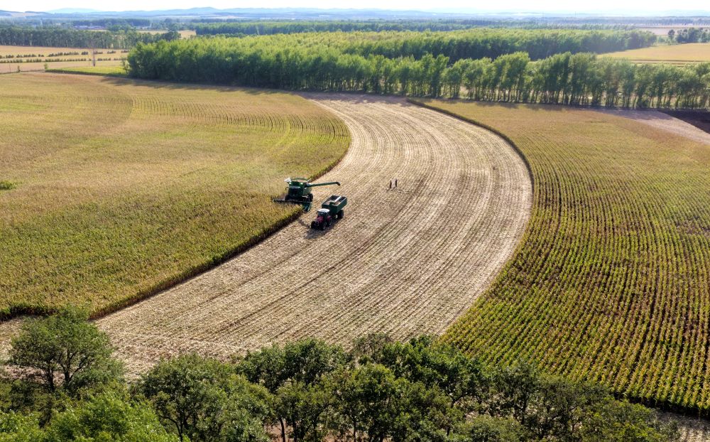 秋高云淡,黑龙江省七台河市勃利县的玉米地里一派繁忙景象。大型收割机往来穿梭,饱满的玉米棒被自动精准收入机身。脱粒后,金灿灿的玉米粒源源不断涌入随行的运粮车。