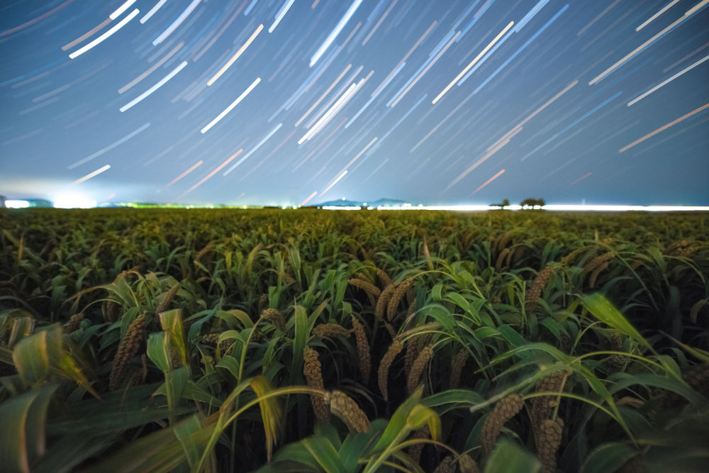 在黑龙江省佳木斯市富锦市拍摄的星空下的谷子(2025年9月17日摄,堆栈合成照片)。新华社发(曲玉宝摄)