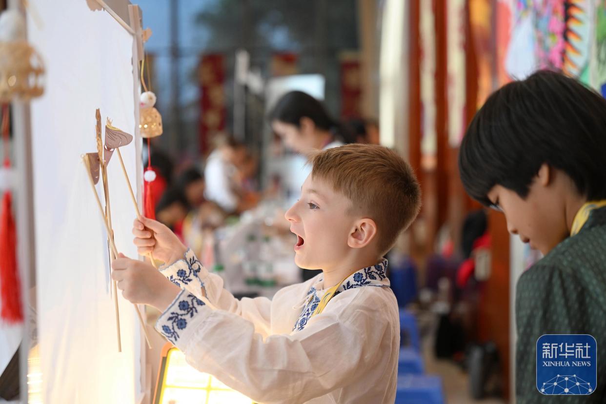 9月26日,小朋友在赛场外体验皮影戏。