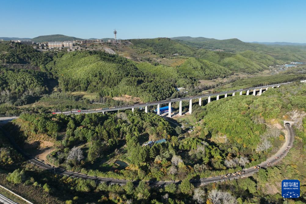 9月27日,满载大宗品类货物的入境列车在滨绥铁路绥芬河至国境线提质改造工程新线路上行驶(无人机照片)。新华社记者 王松 摄