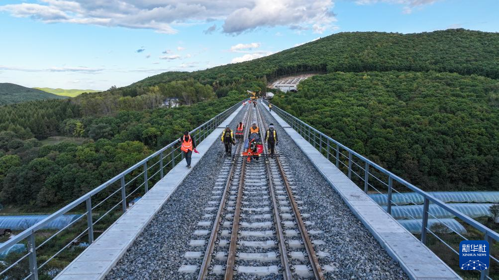 9月26日,工作人员对新线钢轨进行轨距测量作业(无人机照片)。新华社发(曲艺伟摄)