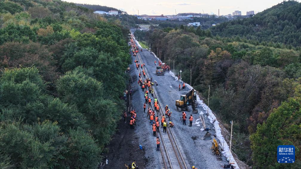 9月26日,施工人员对新线道碴进行填充作业(无人机照片)。新华社发(曲艺伟摄)