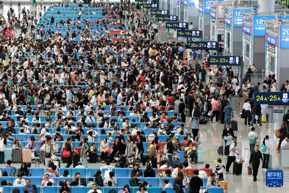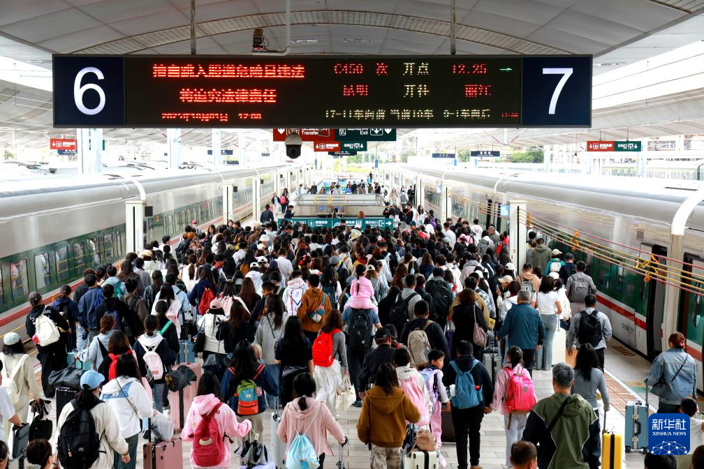 10月1日,旅客在昆明火车站乘车出行。新华社发(郑益摄)
