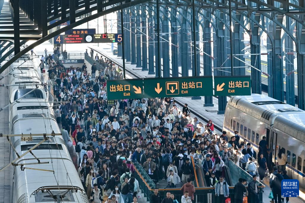 10月1日,旅客在哈尔滨站乘车出行。新华社发(原勇摄)