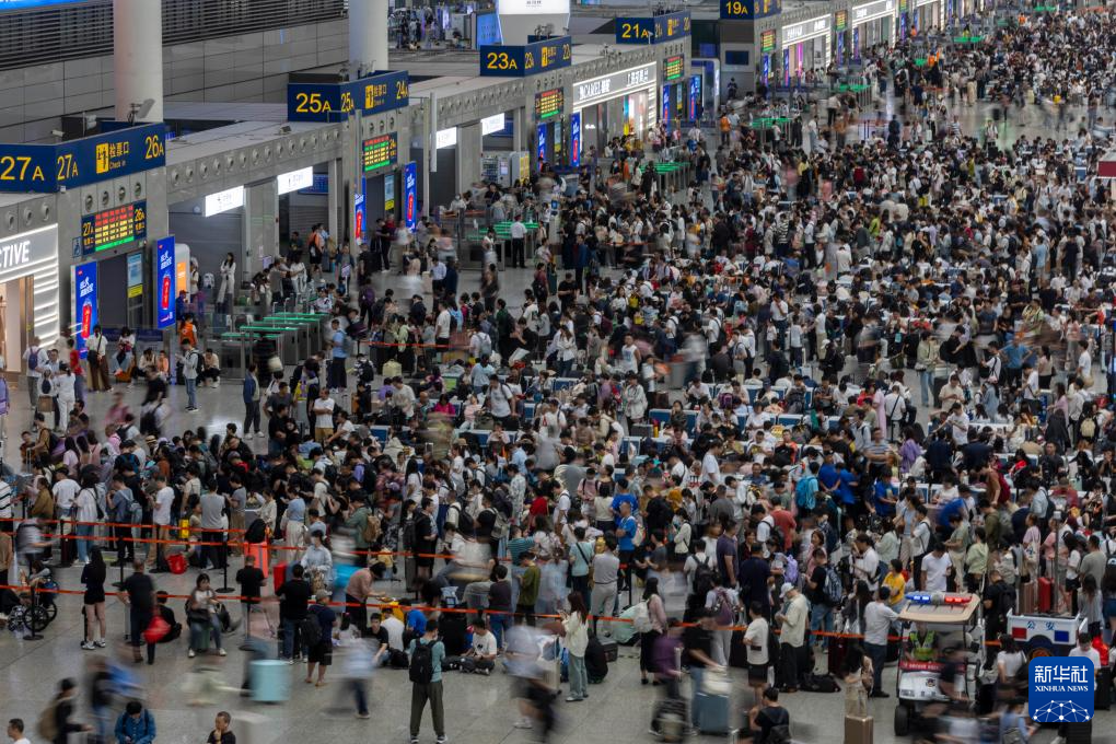 10月1日,旅客在湖北省武汉站东广场进站口准备乘车出行(无人机照片)。新华社发(赵军摄)