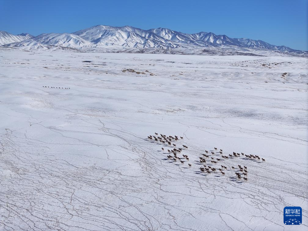 1月9日,一群藏野驴在甘肃省阿克塞哈萨克族自治县阿勒腾乡哈尔腾高原上奔跑觅食(无人机照片)。新华社发(高宏善摄)