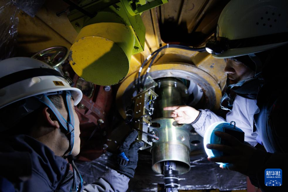 1月24日,工作人员李强(右)和田冬在卫星数据接收系统方位舱进行设备维护。新华社记者 金立旺 摄
