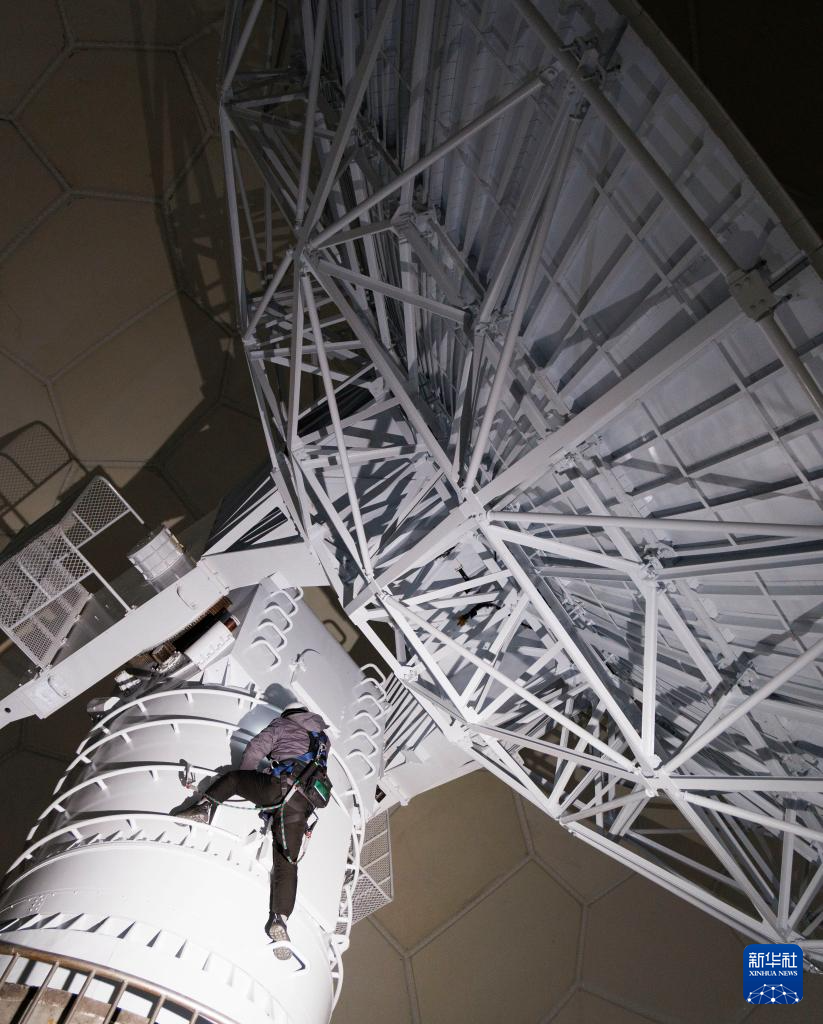 1月25日,站长施胜浦爬上天线准备维护设备。天线系统最高的中心体距地面约10米。新华社记者 金立旺 摄