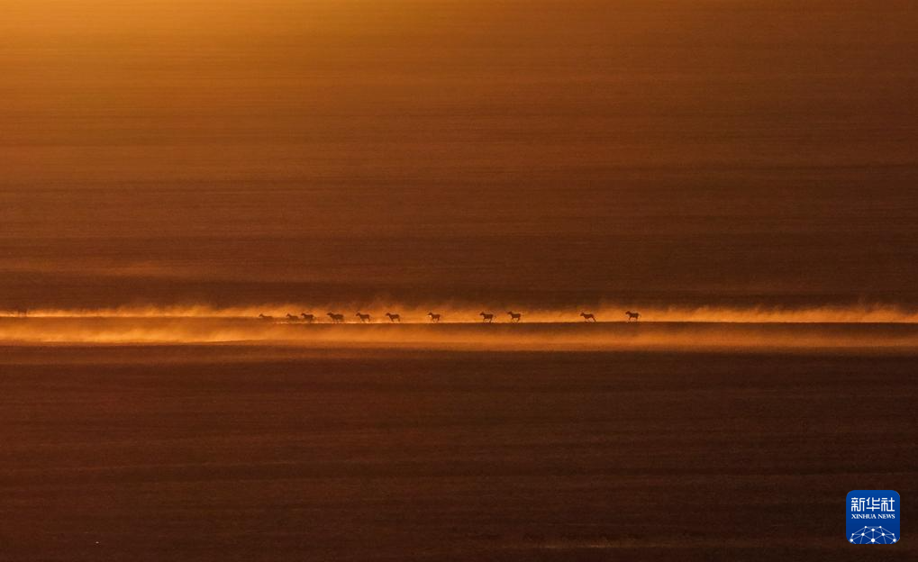 在新疆阿尔金山国家级自然保护区,藏野驴奔跑在日出时的依协克帕提草原上(2025年12月9日摄,无人机照片)。新华社记者 辛悦卫 摄