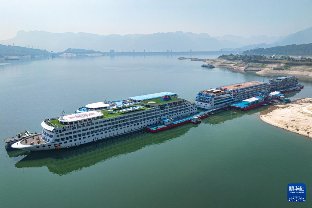 客轮停靠在湖北秭归港码头使用岸电(2024年5月23日摄,无人机照片)。湖北宜昌推进绿色航运,通过港口岸电布局建设,推广新能源船舶应用,港口告别了昔日柴油机轰鸣、众多船舶油烟四散的现象。新华社记者 肖艺九 摄