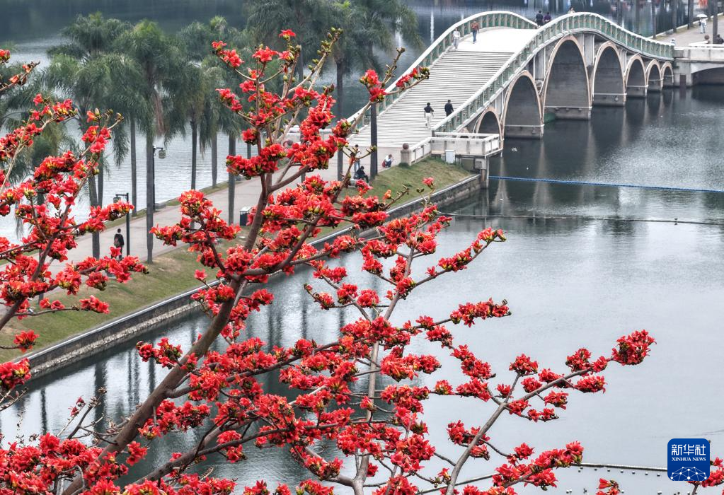 这是广西南宁市南湖岸边盛放的木棉花(3月19日摄,无人机照片)。新华社记者 周华 摄