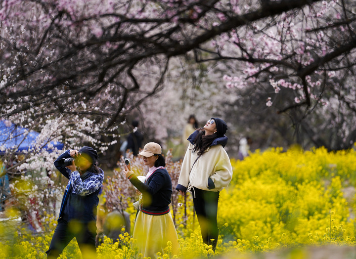 游客在西藏林芝市巴宜区嘎拉村欣赏桃花(2025年4月2日摄)。新华社记者 晋美多吉 摄