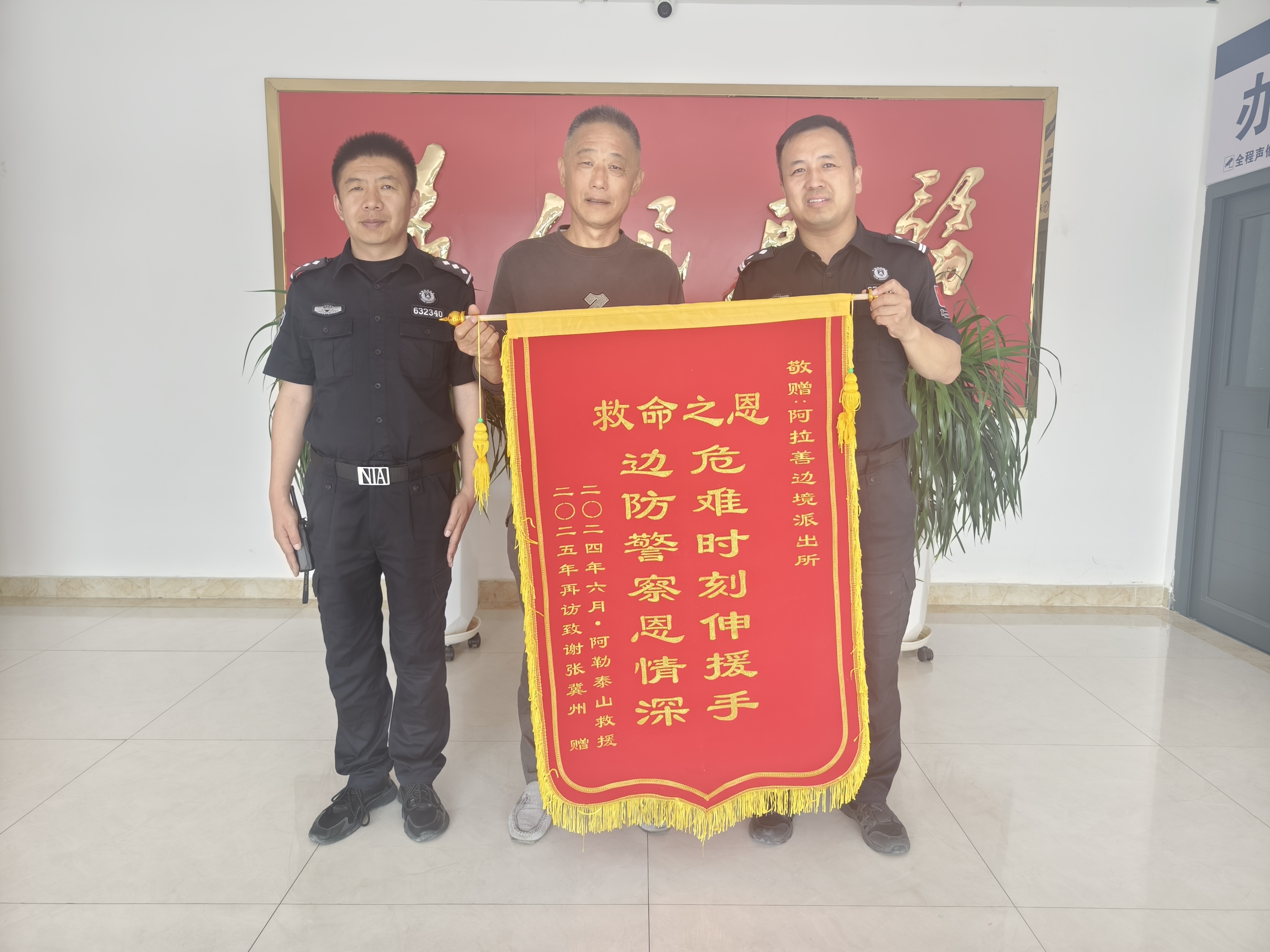 “要不是你们来得快,我可能就挺不过来了!”5月24日,摄影师张先生手捧一面印有“救命之恩 危难时刻伸援手 边防警察恩情深”字样的锦旗,从千里之外的安徽马鞍山赶到阿勒泰,敲响了阿勒泰边境管理支队阿拉善边境派出所值班室的门。这场跨越千里的感恩之旅,源于2024年在千里牧道转场摄影时一段生死时速的救援故事……