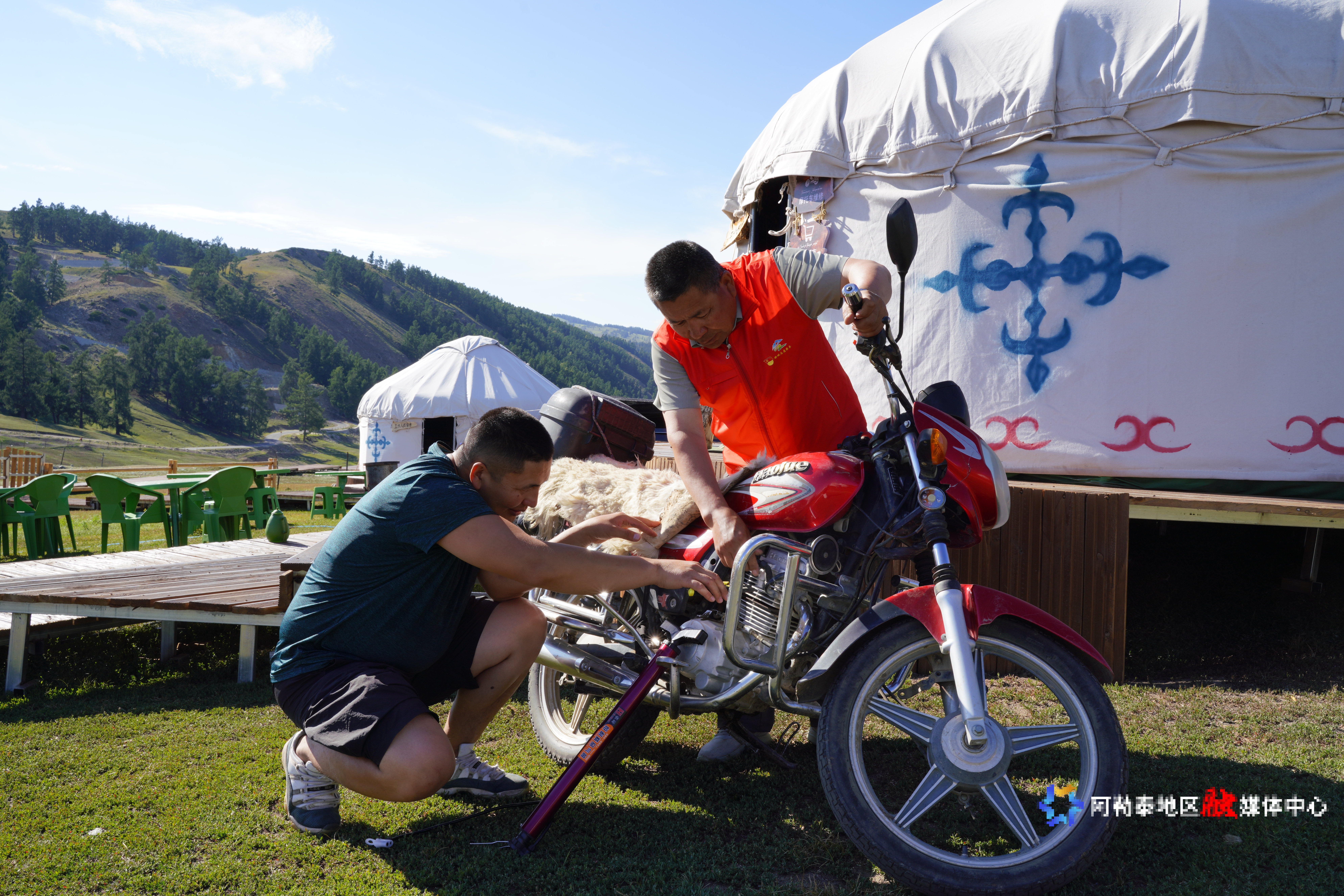 呼吉尔特“石榴籽服务站”党员志愿者为群众修摩托车(童俊彦摄)