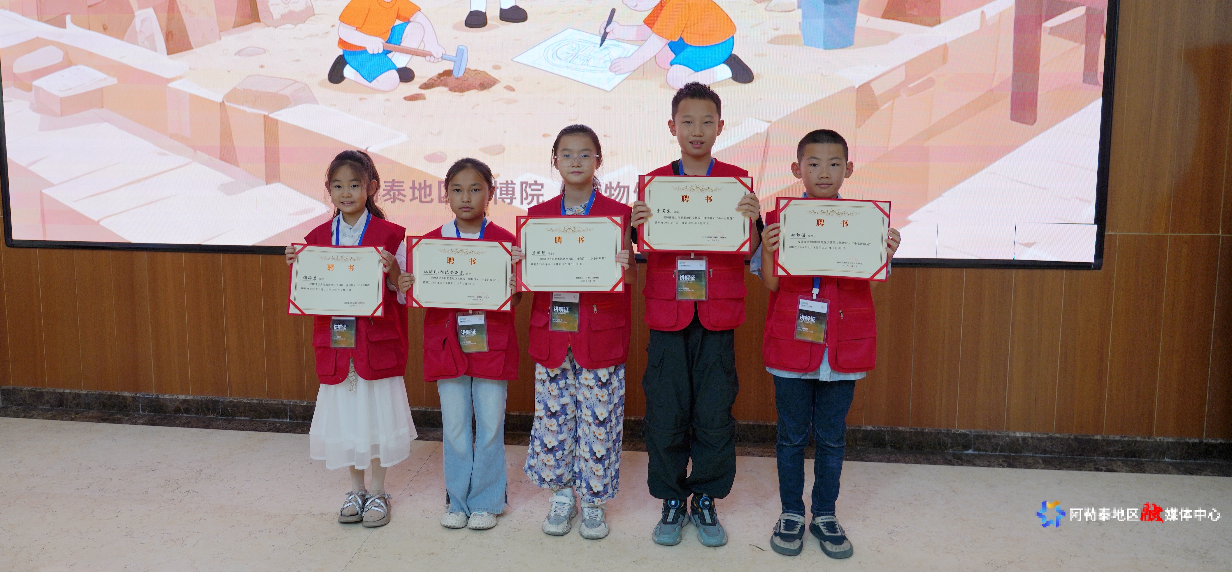 活动为2025暑期“小小讲解员”发放聘书,由暑期培训班选拔出的5名“小小讲解员”率先登场,为小伙伴们讲解阿勒泰地区的历史文化,揭开文物背后的故事。