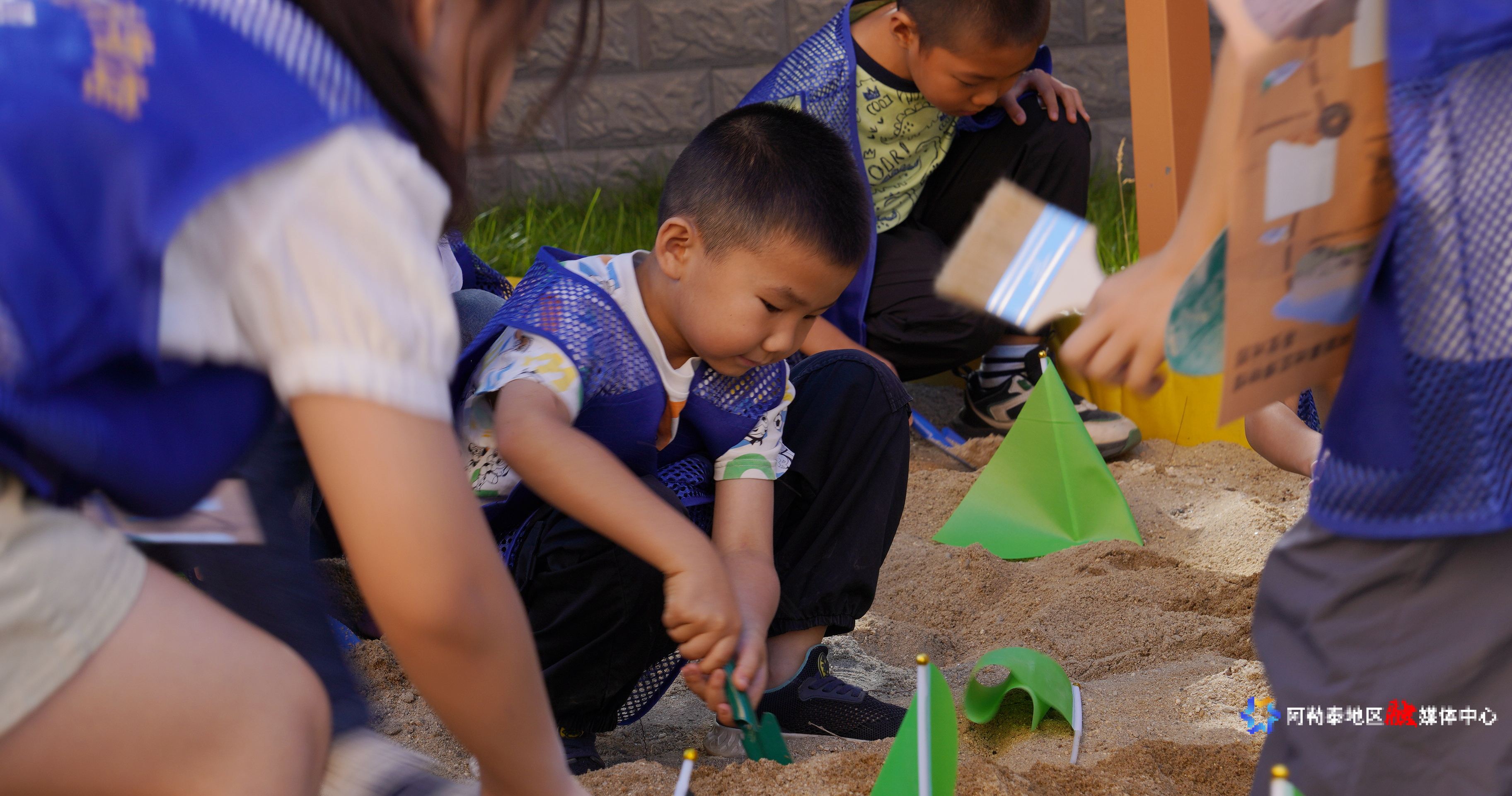 “考古现场发掘”环节把此次活动推向高潮。在30平方米的模拟考古现场,沙池里埋藏着甲骨、瓷器、陶器、青铜、古钱币等“文物”,小小考古队员在志愿者的指导下,手持手铲、刷子、标签尺等工具,小心翼翼地拨开泥土,一步步“发掘”沉睡的“文物”,并认真完成尺寸测量、填写考古调查表等流程。